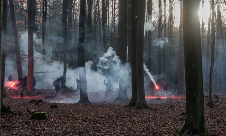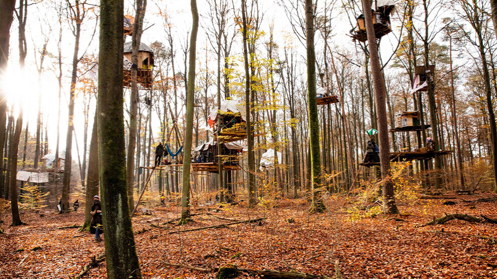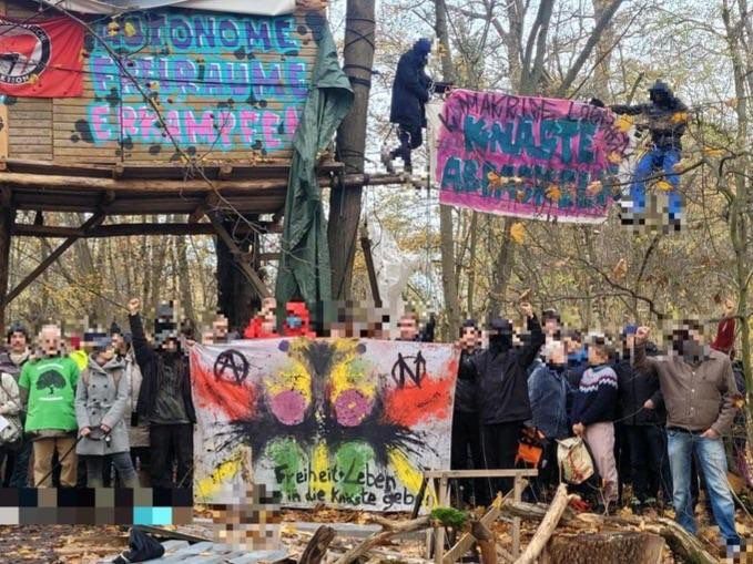 Fire salamanders are precious signs of a healthy ecosystem, as their water permeable skin does not so easily tolerate pollutants. What’s more is that their skin is so delicate, that for them road-kill does not just mean being run over by a vehicle, the sheer vibration of one passing by is enough for their inner organs to rupture. Since the eviction and implementation of the A49 construction, several truckloads of material go in and out of the forests every hour, and I know I am one of many who feel a deep sorrow about this invasion, and a rage towards those that continue down the path of every ecological destruction. Source: a comradeIn the spring of 2020, the construction of the queer feminist or flinta* barrio (safer space from unconscious cis males), caused a palpable rift within the occupation. I put my lot in with those most affected by patriarchy, who still need safer, more comfortable spaces to go beyond surviving and thus thrive in a world created by men for men. I do understand a pushing of cis males out of welcome can be a darker side of feminism, and can limit our unified progression. When our boundaries are finally attuned to, and acted upon by others, in demonstration of an understanding for our oppression, then will we feel forward movement. Slowly I see this happening. This banner at the entrance of barrio Zukunkt, was attributed to the ALF, who in their high-time of the 90s, were at the forefront of struggling with and for beings beyond our species. Source: a esteemed comradeIt can be so easy to get caught up in thinking and being ‘anti – [fill-in-the-blank]’ in this fucked up world. Going on a forest walk and remembering what we’re passionately for, is one of my favourite antidotes. And mushrooms that taste delicious and decompose old worlds! Source: awesome comradesWhen I stepped foot back in the forest in the late summer after a long break, I immediately knew that the barrio, or neighbourhood above who I had heard about named Nirgendwo, was where I was headed. Meeting again folks whom I trust, and their structure of a beautiful central kitchen and sleeping platform (centre left), which quickly expanded into a network of treehouses and defence mechanisms, I learned there so much. Photo credit: ps://anfdeutsch.com/Oekologie/offene-ausstellung-menschen-im-widerstand-am-dannenroder-wald-28492It was during one of the many days during the eviction of Danni, and plenty of cops were around. I decided to go on a mission through the forest and word of mouth told that ‘something’ was about to happen. On my way back, taking the road down to barrio Nirgendwo, I turned to see what was that noise behind me. I gasped to see a river of black, a mass that had arrived to the camp from various cities, and their march was obviously signalling a showdown. I picked up my pace, got back to base and told everyone to get themselves and important stuff off the ground, now. A new energy whirled through the place, as we watched from above the fireworks, flares and menace clashing with the police, those that don’t protect us, we know our crew protects us. Photo credit: http://keinruhigeshinterland.org/2020/12/08/eine-autonome-einschaetzung-zur-fortfuehrung-des-kampfs-im-dannenroeder-wald/Sitting in a cell and hearing the chants and whistles of a demo erupting on the other side of the complex was a vibration so physically, emotionally and mentally shifting. I received a photo of this banner which on another occasion had made it’s way to a weapons factory blockade, linking the struggles to that against Turkish fascist bombardment of Rojava. Photo credit: https://jungle.world/artikel/2021/39/ein-klima-fuer-radikalitaet Below is also a video from comrades that reminds me of the prison visit we were graced with on 13.12.2021 https://freethemall.blackblogs.org/category/soliaktionen/Poster for the documentary film screening about the Ella case ‘and the state power that wants to intimidate and disguise’, which includes footage of a theatrical re-enacting of the arrest, staged in front of the local ministry of economics. The date the film was released and screened in over a hundred locations, a year later commemor-action from when the first trees were first felled at Danni’s neighbouring Herrenwald forest. Watch here https://youtu.be/XzO9vIUHCHM?feature=shared Read English translation of film