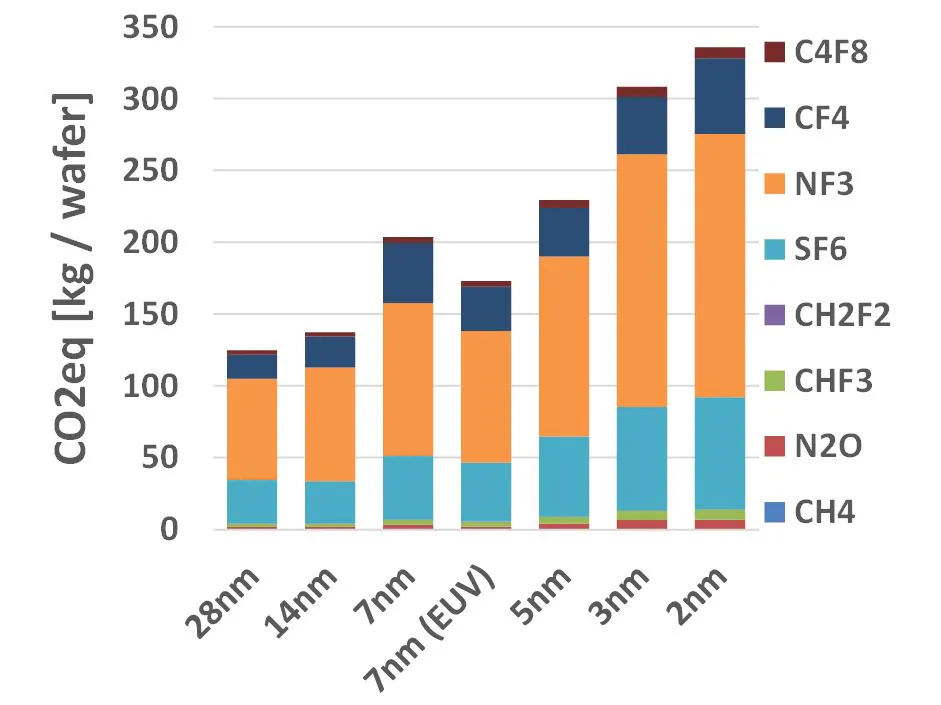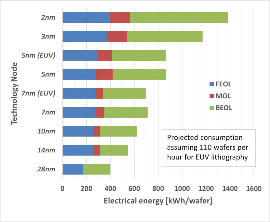 Gehen wir von einem gleichgroßen Stück einer Siliziumscheibe für einen Computerchip aus, so benötigt die modernste 2nm-Prozesstechnologie zur Herstellung erheblich mehr Strom- (x3,5) und Reinstwasser (x2,3) gegenüber der älteren 28nm-Technologie. Der Ausstoß an Treibhausgasen (in CO2-Äquivalenten) steigt um das 2,5-fache (je Computerchip).2
