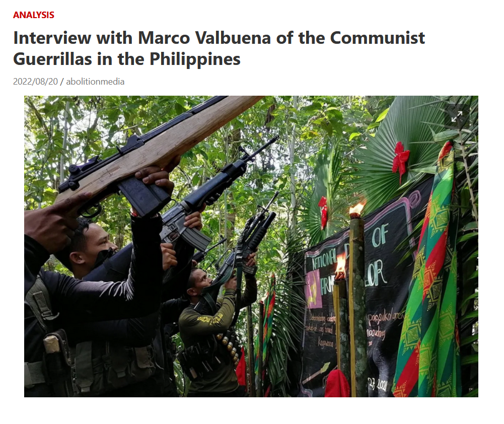 In 2022, Abolition Media sympathetically interviewed a member of the Communist Party of the Philippines and uncritically published dozens of official National Democratic Front communiques while completely ignoring Filipino anarchists who rightly reject the NDF vanguardists for their collaboration with the State, murdering of their own cadre and a union leader, and nationalism.