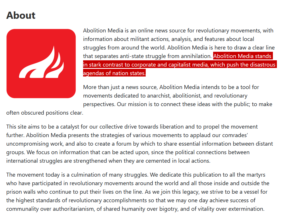 Despite their claim that they “stand in stark contrast to corporate and capitalist media, which push the disastrous agendas of nation states,” Abolition Media publishes more statements from authoritarian groups that are fighting to govern nation states, and news outlets that are either controlled by nation-states such as RedStream, or capitalist funded with strong alignment to specific nation-states, than they do statements from or about anarchists.