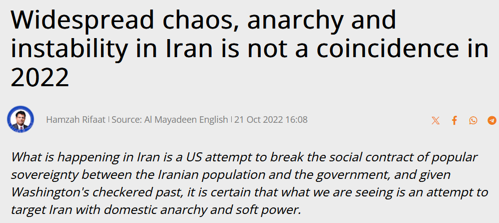 To highlight Al-Mayadeen’s distance from anything resembling an abolitionist politic, let’s look how they defended the Iranian regime with rote campist talking points about 2022’s popular feminist uprising against the state: