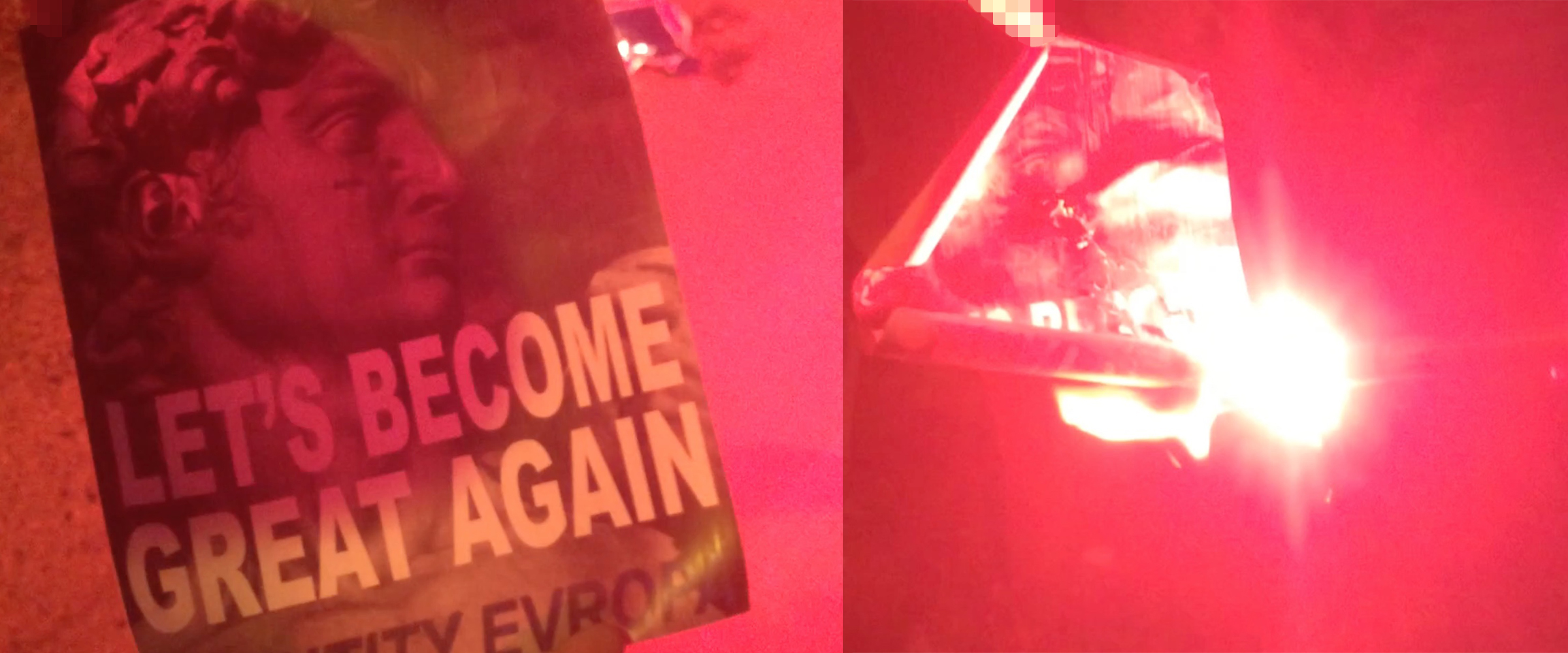 3Lastly, we burnt a fascist poster that had been torn down last week in Minneapolis. Despite their updated aesthetics, the “Alternative Right” is anything but an alternative, and we will make their development in the Twin Cities as difficult as possible. This task appears easy at the moment, given that only a single poster was put up in the city. And it burned quite colorfully thanks to the ink!