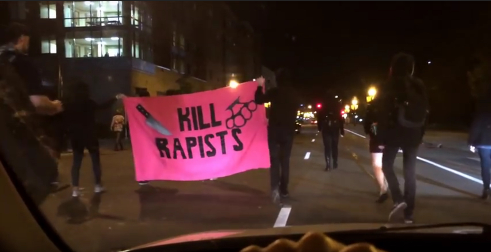 30 to 40 folks gathered near frat row, ready to show the boys how to throw a real banger. Our party decorations included flares, a sparkly pink “KILL RAPISTS” banner imploring bystanders to connect with the rage that thousands of survivors feel, and our middle fingers. We casually strolled onto University Ave, chanting “fuck frats!” and “anytime, any place, punch a rapist in the face!” Our voices were accompanied by a marching band, cuz what good soirĂ©e is complete without a brass section?