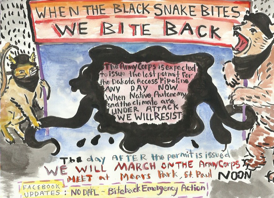 Governments and corporations have only as much power as we cede them. We are calling all who oppose colonization, patriarchy, racism, all who struggle for a habitable planet and life on our own terms to converge on Mears Park in St. Paul the day after the permit is issued. When the bloody lips of progress move to kiss, we spit fire!