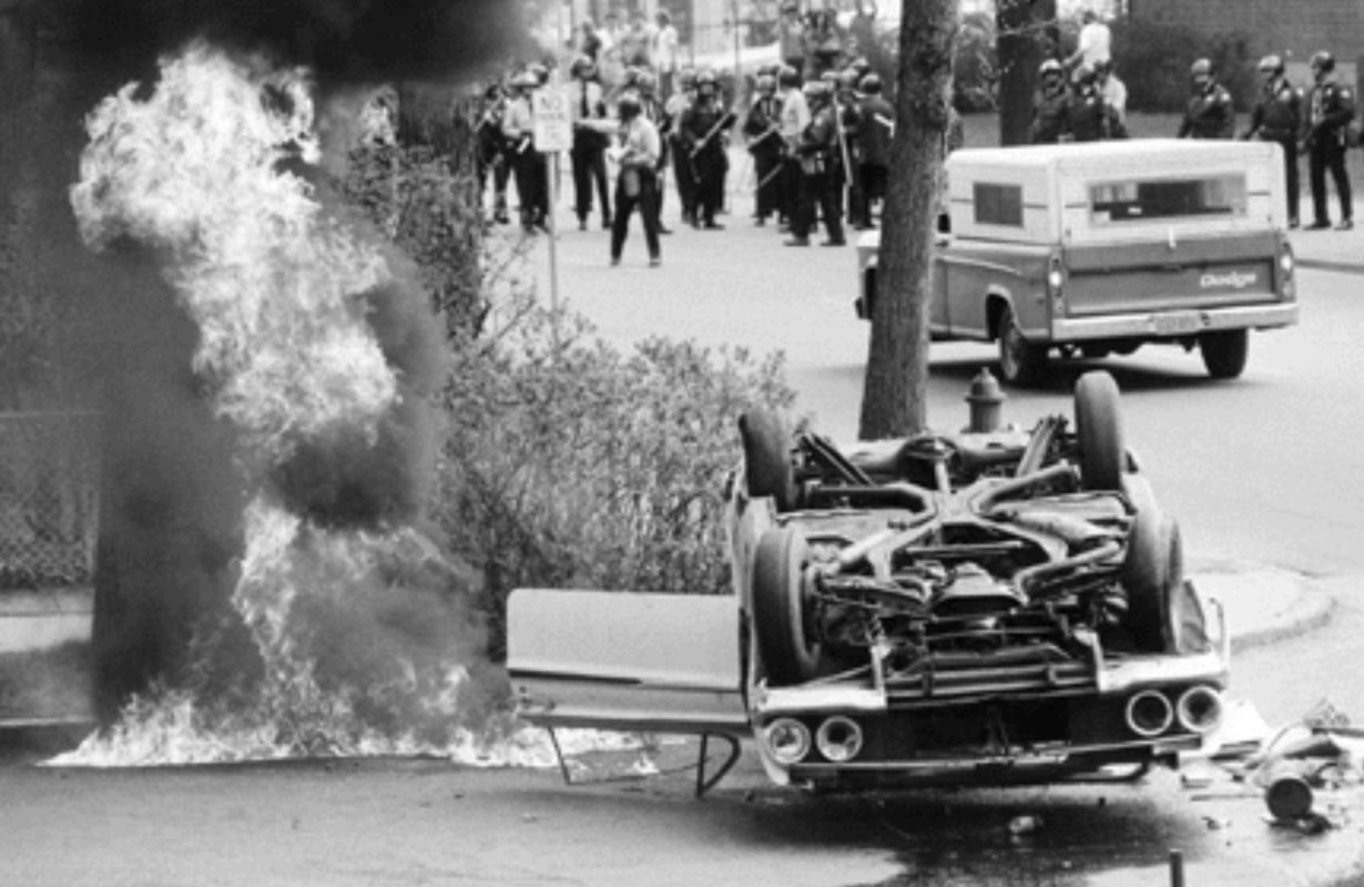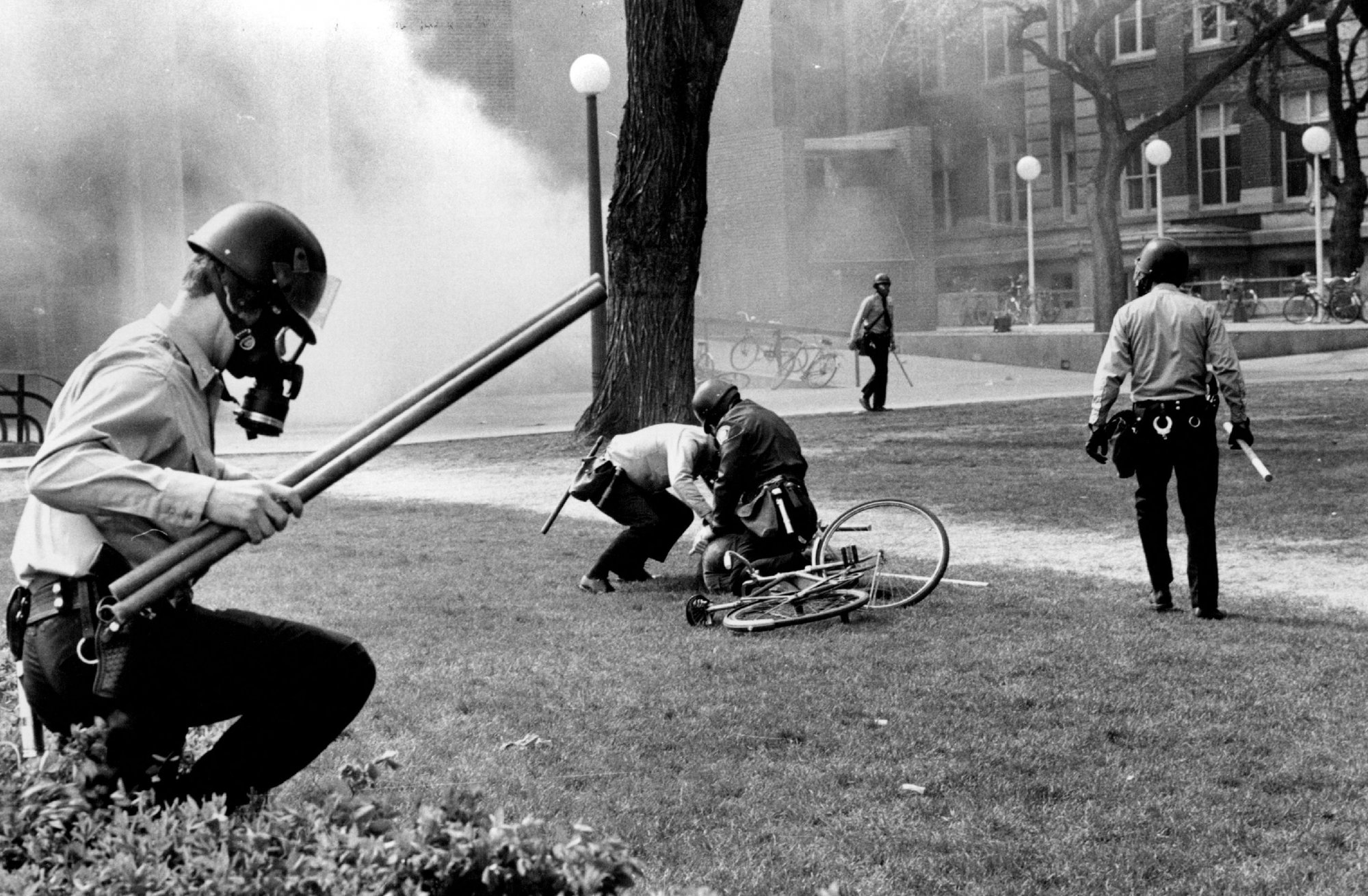At about 1 p.m., University police were watching paper fall from broken windows. It was windy and the papers blew every which way, just as the rocks being thrown by protestors. Protestors were tearing down an iron fence surrounding the Armory. An overturned 1962 Chevrolet burned in the streets as protestors chanted: “One. Two. Three. Four. We don’t want your fucking war.” A few blocks away, three 30-man squads of police in full riot gear were preparing to march towards the armory. The University Vice-President had gotten wind that protestors planned to burn down the armory. So he called in the police.