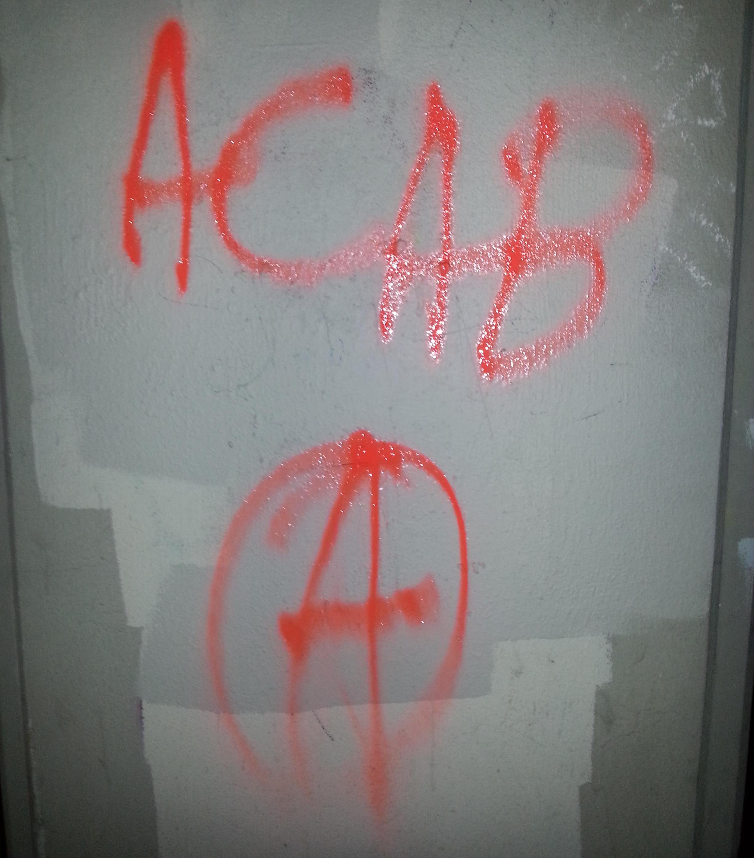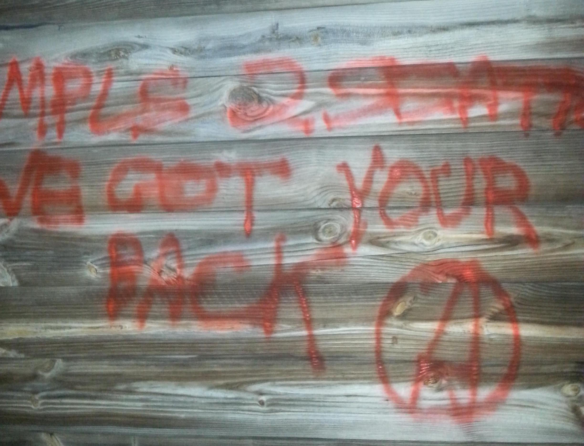 1On May 1st, 2016 people from around the world commemorated International Workers and Immigrants Rights Day. What began as an explosion of violent rebellion in an industrial district of Chicago in response to police killing striking workers fighting for the 8 hour work day has become an international holiday where the fires of Haymarket are reignited time and time again. In Seattle, the demonstrations took a radical turn that has become almost ritualistic in that city. Anarchists clashed with police and bravely fought back against pepper spray and concussion grenades with rocks, bottles, fireworks, and police even allege that molotov cocktails were used. 9 arrests were made and 5 police were injured. In Chicago 19 protesters were arrested after a noise demo in front of the Cook County Correctional Facility. Here in Minneapolis, we know about state repression. Movements such as AIM, Black Lives Matter, the IWW, and the RNC Welcoming Committee have all experienced state repression that attempting to squash these movements for liberation from capitalism. Trust us when we say that we have no love for the police here, especially after the ruthless killing of Jamar Clark. In response to this police repression, a highway overpass and retention wall were redecorated with antagonist slogans: