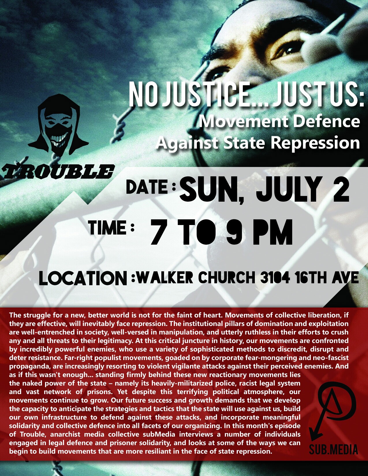 The struggle for a new, better world is not for the faint of heart. Movements of collective liberation, if they are effective, will inevitably face repression. The institutional pillars of domination and exploitation are well-entrenched in society, well-versed in manipulation, and utterly ruthless in their efforts to crush any and all threats to their legitimacy. At this critical juncture in history, our movements are confronted by incredibly powerful enemies, who use a variety of sophisticated methods to discredit, disrupt and deter resistance. Far-right populist movements, goaded on by corporate fear-mongering and neo-fascist propaganda, are increasingly resorting to violent vigilante attacks against their perceived enemies. And as if this wasn’t enough… standing firmly behind these new reactionary movements lies the naked power of the state – namely its heavily-militarized police, racist legal system and vast network of prisons. Yet despite this terrifying political atmosphere, our movements continue to grow. Our future success and growth demands that we develop the capacity to anticipate the strategies and tactics that the state will use against us, build our own infrastructure to defend against these attacks, and incorporate meaningful solidarity and collective defense into all facets of our organizing. In this month’s episode of Trouble, anarchist media collective subMedia interviews a number of individuals engaged in legal defense and prisoner solidarity, and looks at some of the ways we can begin to build movements that are more resilient in the face of state repression.
