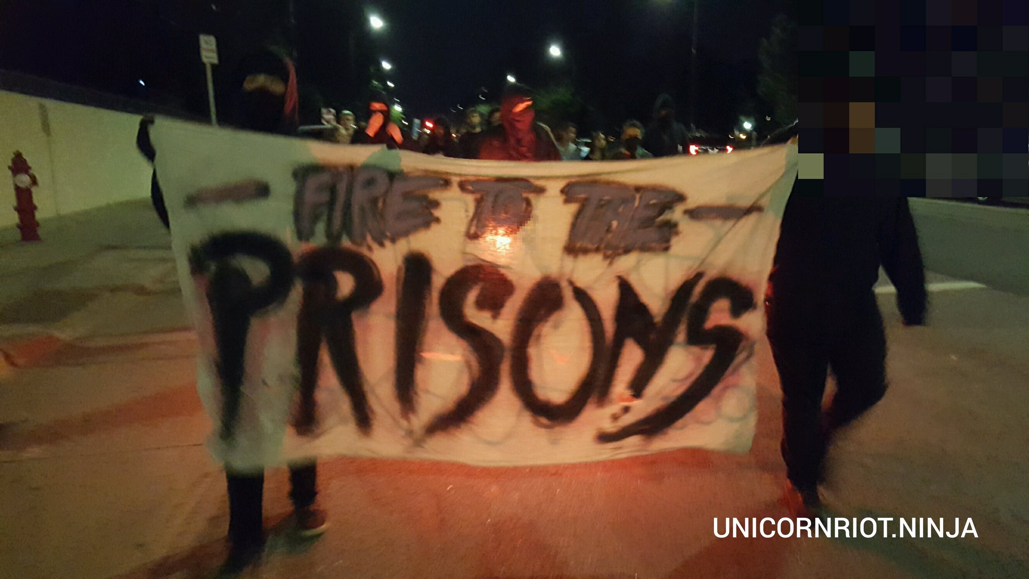 At 8pm, answering the call for a noise demo in solidarity with the September 9th prisoner’s strike and to commemorate the 45th anniversary of the Attica uprising, people gathered in Elliot Park preparing to march on the juvenile detention center. A small black bloc arrived, carrying a banner that read “FIRE TO THE PRISONS” and began marching through the park. Flyers were handed out along the way to some of the people gathered at the park for a barbecue and to play soccer. Once we took the streets, construction barricades were dragged into the street to block them off for the march and to slow down any advancing police. We arrived at the youth jail after passing by the obnoxious new Vikings stadium and got some shouts of approval from skateboarding teenagers who even briefly joined us in shouting “Fuck 12!”