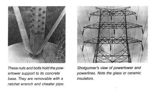 Another effective method, where noise is not much of a problem, is to shoot out the insulators holding the power cables themselves. A twelve-gauge shotgun loaded with double-ought shot is the best tool. Walk under the line until you are directly beneath the insulators on a tower. With your back to the wind, take two large steps backwards, aim at the insulators, and commence firing. Be prepared to dodge large chunks of falling glass.
