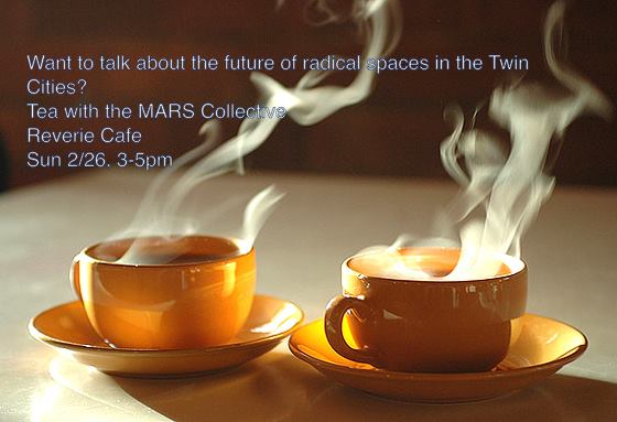 Tea Time with the MARS Collective Anonymous submission to Conflict Minnesota Sunday, February 26th Reverie Cafe 1931 Nicollet Ave 3:00 PM Have tea with the MARS Collective and discuss the future of anarchist spaces in Minneapolis!