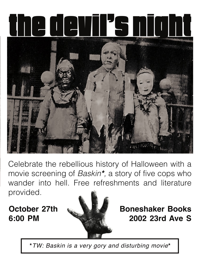 Come celebrate the rebellious history of Halloween with a movie screening of Baskin*, a story of five cops who wander in to hell.