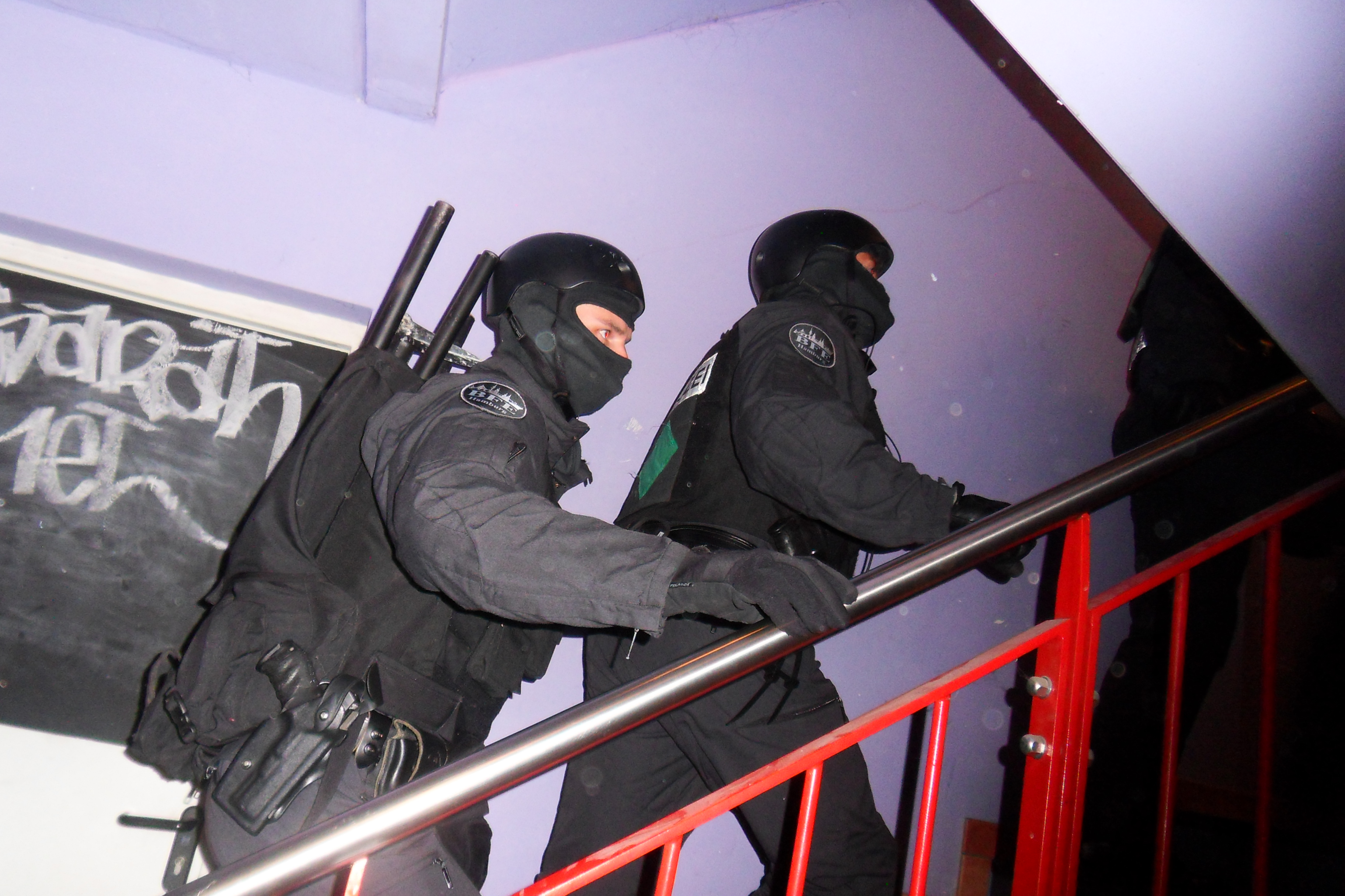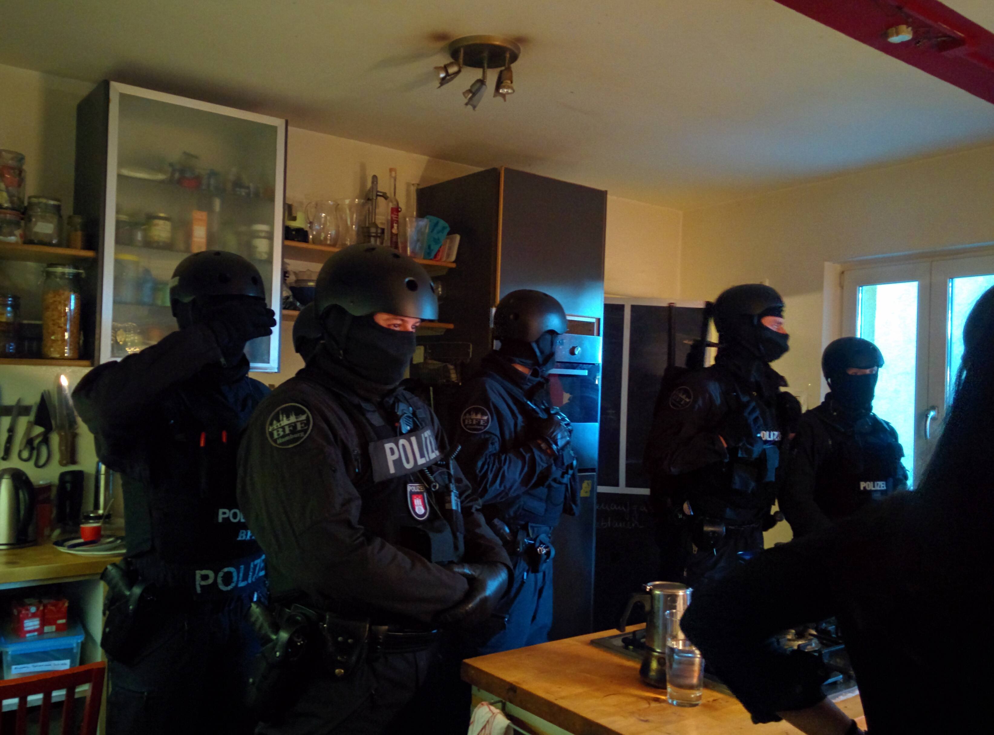 Angesichts des vagen Vorwurfes und der Tatsache, dass nichts Relevantes gefunden wurde, wird klar, dass sich diese Durchsuchung nicht gegen eine tatsächlich begangene Straftat richtete, sondern einzig und allein der Einschüchterung der Bewohner_innen des Hausprojektes diente. Der heutige Polizeieinsatz stellt bislang den Höhepunkt einer Militarisierung des Stadtteils dar, den wir in den vergangenen Monaten beobachten konnten. Nahezu täglich werden Menschen von der Polizei durch St. Pauli gejagt, zu Boden geworfen und brutal festgenommen. Zur Erinnerung: das Revier der Davidwache hat mittlerweile die höchste Polizeidichte Deutschlands.