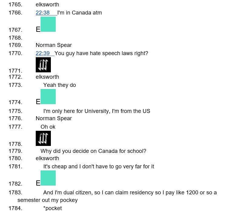Nathan was a member of The Base and participated in the chats as “Elksworth.” In the chat, “Elksworth” reveals that he is in Canada, but originally from the United States. He explains that this is only for University, and that he doesn’t pay much since he can claim residency. Earlier in the chat, “Elksworth” introduces himself to his fellow violent fascists as “IronWill,” his Fascist Forge username. Nathan uses a separate username in The Base Book Club Discord server, introducing himself as “Hyperboreansun.”