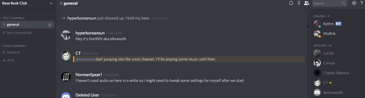 Nathan Guerrette aka “Elksworth” enters The Base chat and “Doomsayeth” (Jerod M. Elder) and “Norman Spear” welcome him.