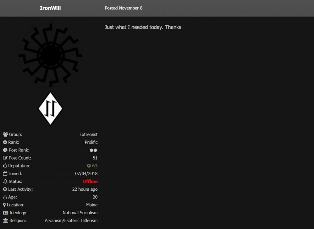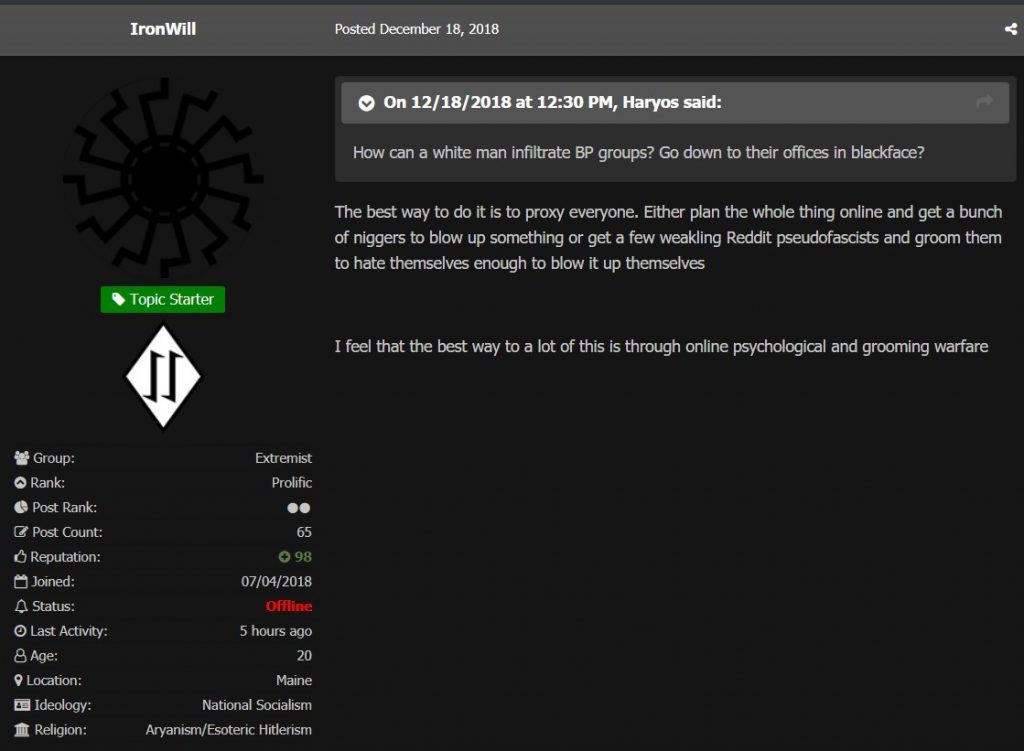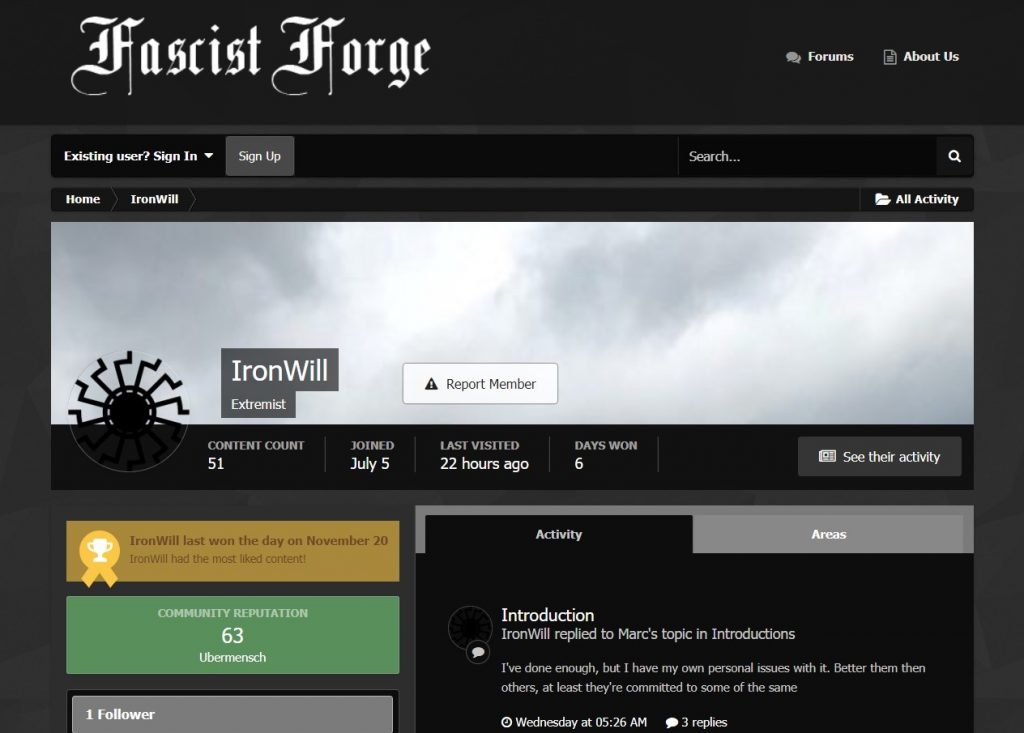 Another Reddit post references the website Fascist Forge, a website created in spring 2018 for the purpose of connecting fascists to one another to organize and ultimately commit acts of violence. Nathan is a contributor to the site and uses the username “IronWill.” He lists his ideology as “National Socialism,” and encourages his fellow fascists to buy cheap land, “so you don’t need the bank for the collapse.” He claims to have already begun preparing for this collapse with his fiancé. His account received attention after he kicked off a conversation about “realistic direct action.” He asked users “Without going Breivik at the moment, what would you say are levels of destruction that can be managed at a lower level?” In one conversation on Fascist Forge, Nathan responds to a user who posted a document called “The Terrorist’s Handbook,” saying “Thanks. Made my day.”