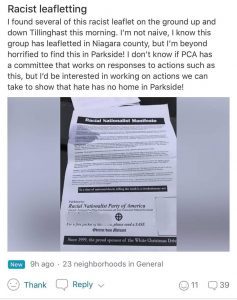 (Screenshot Posted on Nextdoor, flier found on Tillinghast Pl. in Parkside, North Buffalo, March 24, 2019.)