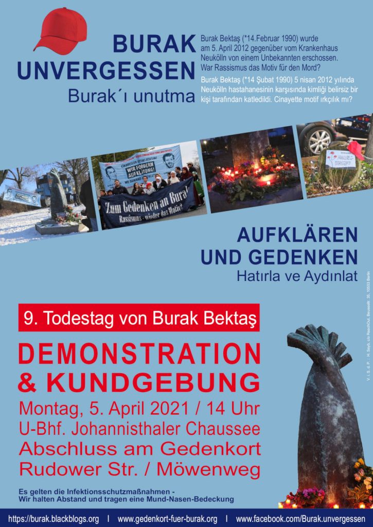 Burak ist vor 9 Jahren ermordet worden. Der Mord wurde bis heute nicht aufgeklärt. Seine Familie leidet immer noch darunter. Zeigt euch solidarisch und lasst sie damit nicht alleine. Kommt auf die Demo, kommt zum Gedenkort. Seit Jahren verüben Neonazis Anschläge in Neukölln. Die Polizei hat diese bisher nicht aufgeklärt. Das dürfen wir nicht einfach passieren lassen. Auch auf den Gedenkort für Burak wurden zwei Anschläge verübt. Besucht den Gedenkort. Schützt ihn vor weiteren Anschlägen.