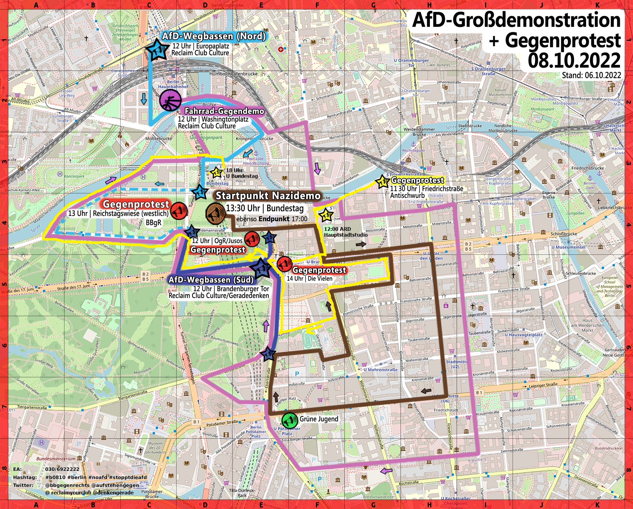 - 12.00 Uhr, Startort Rahel-Hirsch-Str. (Washingtonplatz/südlich HBF) Gegenprotest-Fahrradkorso mit Soundbikes aus der Clubszene von Reclaim Club Culture