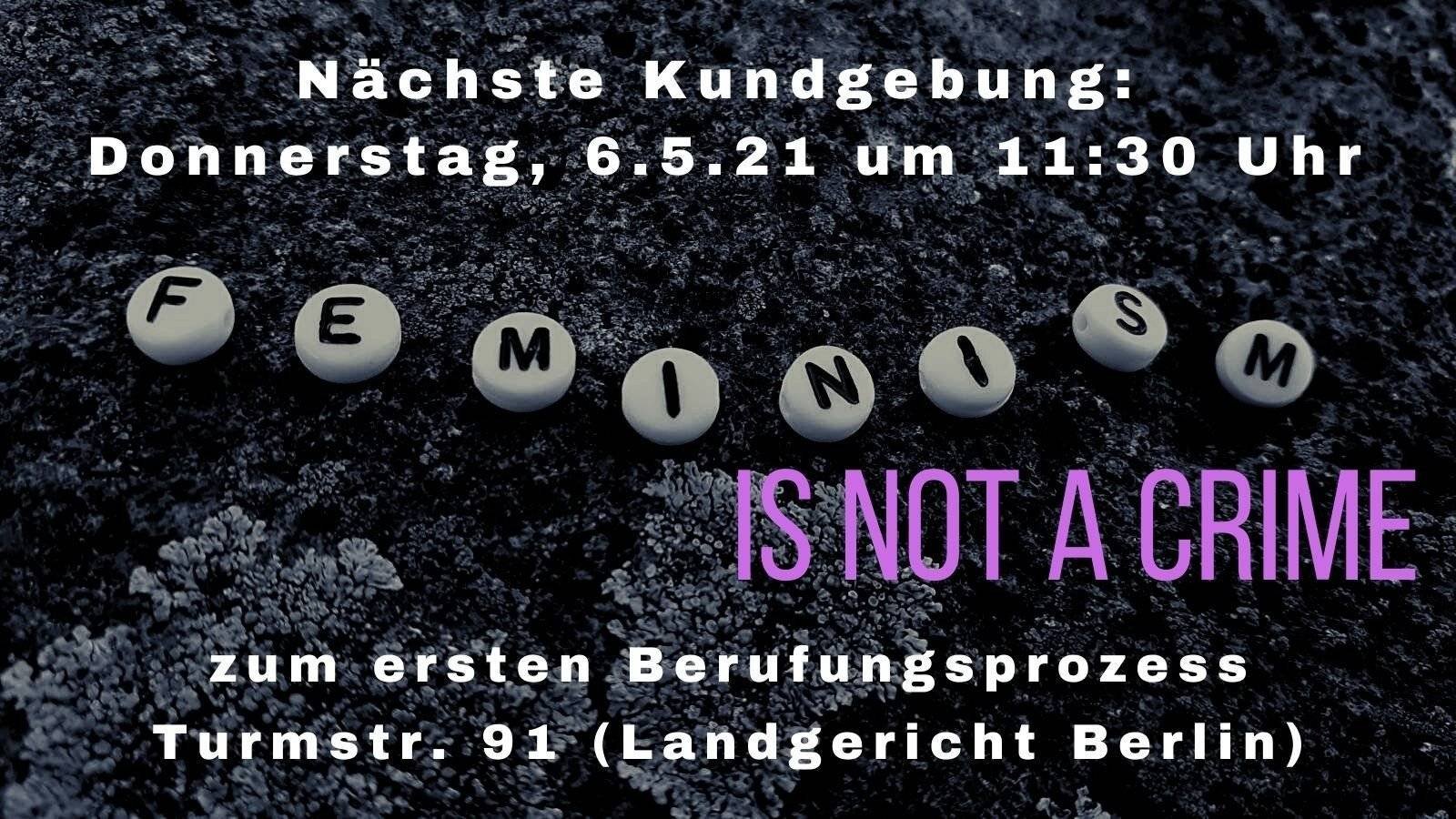 Feminism is not a Crime! Kommt zur Kundgebung am 6. Mai um 11:30 vorm Landgericht (Turmstraße 91).