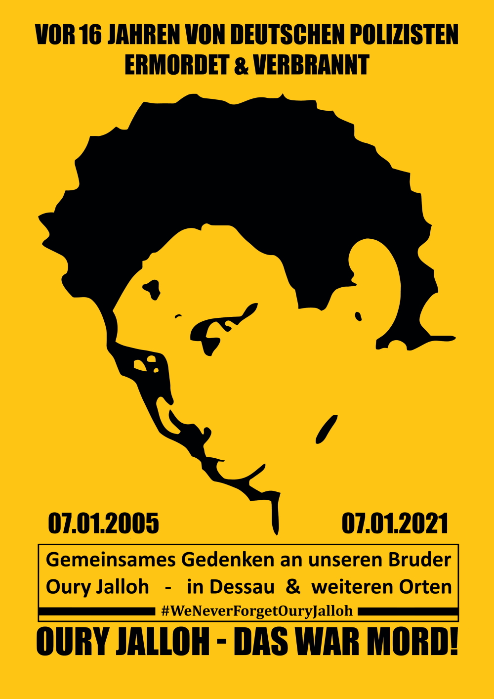 Oury Jalloh wurde am 07.01.2005 von Polizisten auf dem Dessauer Polizeirevier in Gewahrsam bis zur Unkenntlichkeit verbrannt. Durch unabhängige Gutachten und Aufklärungsarbeit der letzten 15 Jahre wurde das durch die Initiative Oury Jalloh belegt. Die deutsche Justiz verweigert sich aufzuklären und behauptet, dass Oury Jalloh sich selbst angezündet habe. Alle Tatsachen sprechen dagegen. Nicht zuletzt verkündeten dieses Jahr im August 2020 die Sonderberater des Landtages Sachsen-Anhalts, dass sie weiterhin an der Täterversion der Selbstanzündungsthese festhalten und Oury Jalloh weiterhin kriminalisieren. Wir wissen:
