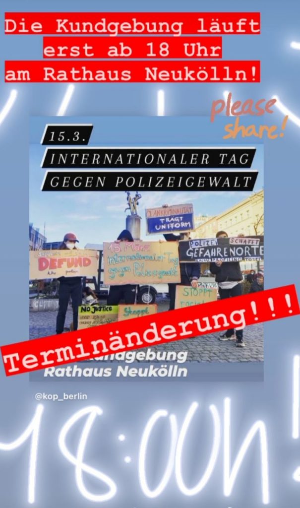 Wir möchten euch am 15.3.2021 um 17h dazu aufrufen, an unserer Kundgebung vorm Rathaus Neukölln teilzunehmen, um gemeinsam den Menschen zu gedenken, die in Deutschland von der Polizei ermordet wurden, wir möchten uns mit Betroffenen solidarisieren und das Thema rassistische Polizeigewalt weiterhin an die Öffentlichkeit bringen. Wir wollen auch darauf aufmerksam machen, dass sich jede*r zu diesen Kontrollen und Schikanen verhalten kann. Schaut hin, fragt nach und bietet euch als Zeug*innen an!
