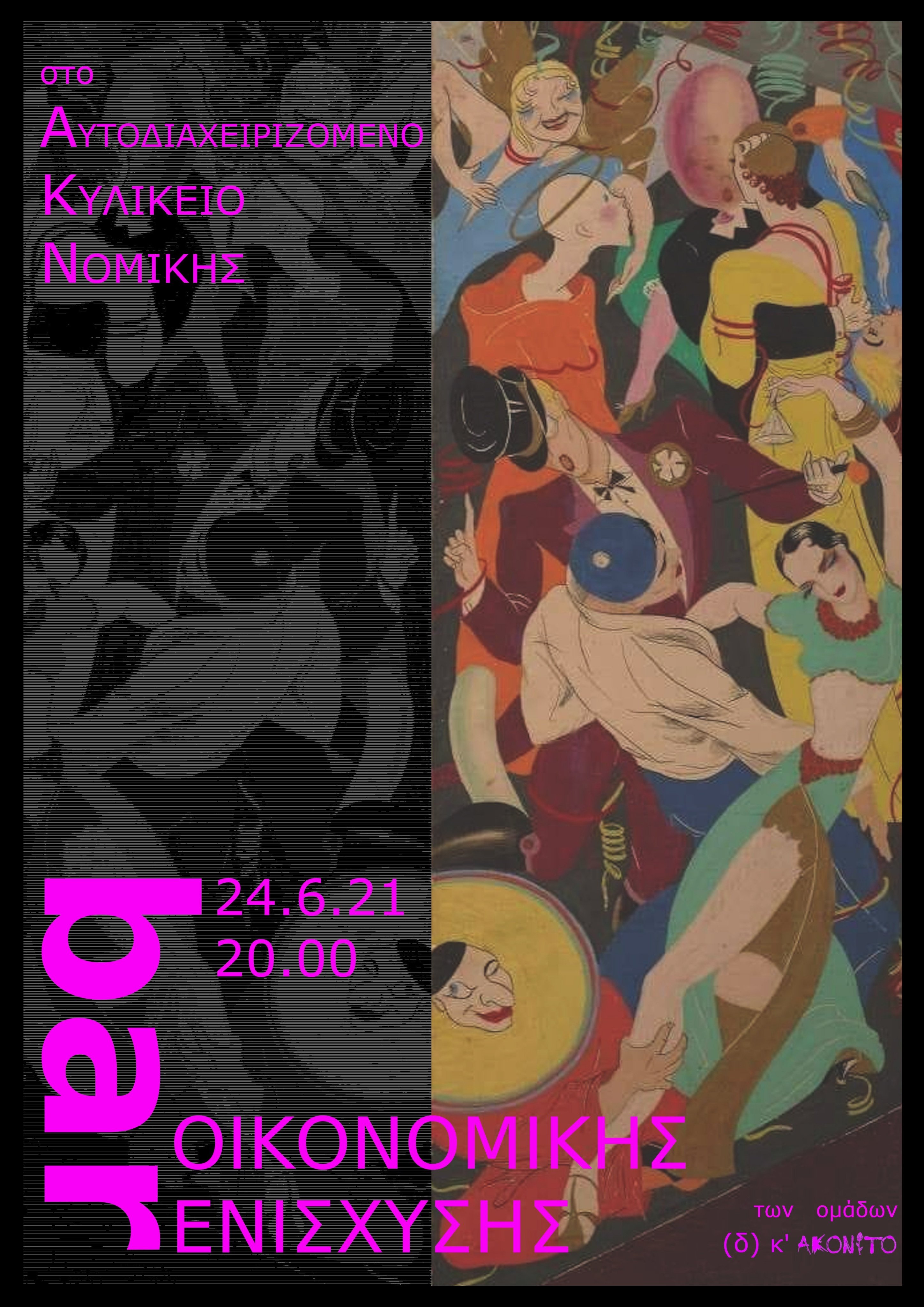 Στις 24.6.21, στις 8μμ, διοργανώνουμε μπαρ οικονομικής ενίσχυσης στο ΑΚΝ, έναν κατειλημμένο, αυτοοργανωμένο πολιτικό χώρο, για να συναντηθούμε, να επικοινωνήσουμε, να χορέψουμε, να φλερτάρουμε, να περάσουμε όμορφα.