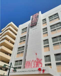 Πανό που αναρτήθηκε στη Νομική την πρώτη βδομάδα μαθημάτων από Στέκι Καλιαρντά και (δ)ιαθεματική, ΑΚόΝιτο που στεγάζονται στο ΑΚΝ (Αυτοδιαχειριζόμενο Κυλικείο Νομικής).