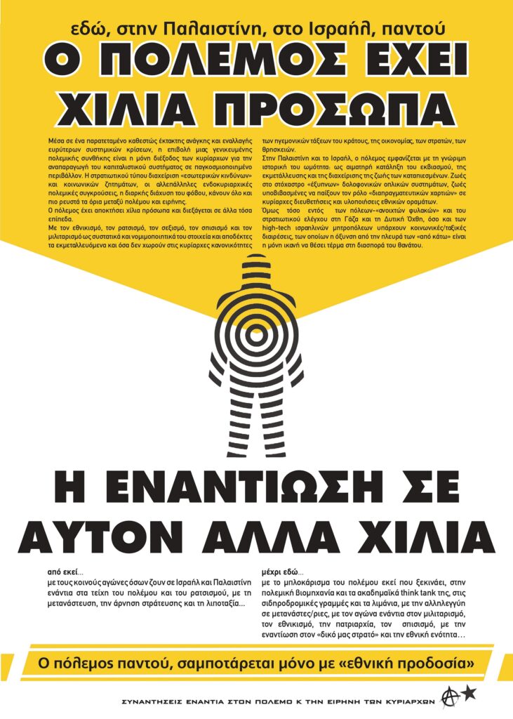Κλείνουμε πονηρά το μάτι σε όσα είναι καχύποπτα με την ευγενική ρητορική του δημοκρατικού κόσμου. Στεκόμαστε αλληλέγγυα στους εκατοντάδες χιλιάδες ανυπότακτους των επιστρατεύσεων της ουκρανίας και ρωσίας που αρνούνται να γίνουν αναλώσιμοι στα πολεμικά παιχνίδια των κυριάρχων. Στους αρνητές στράτευσης και κάθε αντιστεκόμενο εντός του ισραήλ και της παλαιστίνης. Στεκόμαστε αλληλέγγυα στα μεταναστά που δέχονται τη βία των συνόρων, των κρατών, των εθνικισμών, της πατριαρχίας. Μια αλληλεγγύη που μας κάνει συνεχώς να επαναλαμβάνουμε: κανένα δεν είναι πραγματικά ελεύθερο, αν δεν είμαστε όλα μας.