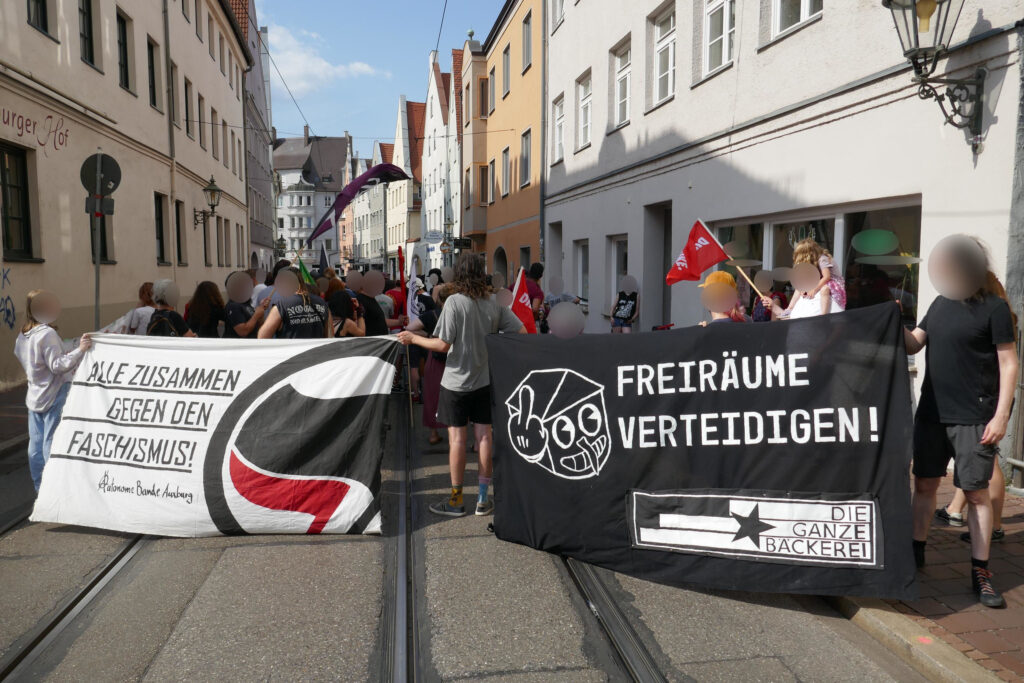 Zum Abschluss der Demonstration konnte ein starkes Zeichen gesetzt werden, indem sich 150 Augsburger*innen schützend vor die Ganze Bäckerei stellten. Wir zeigten, dass wir diesen wichtigen politischen Freiraum der Stadtgesellschaft verteidigen und solidarisch mit allen Betroffenen staatlicher Gewalt stehen.
