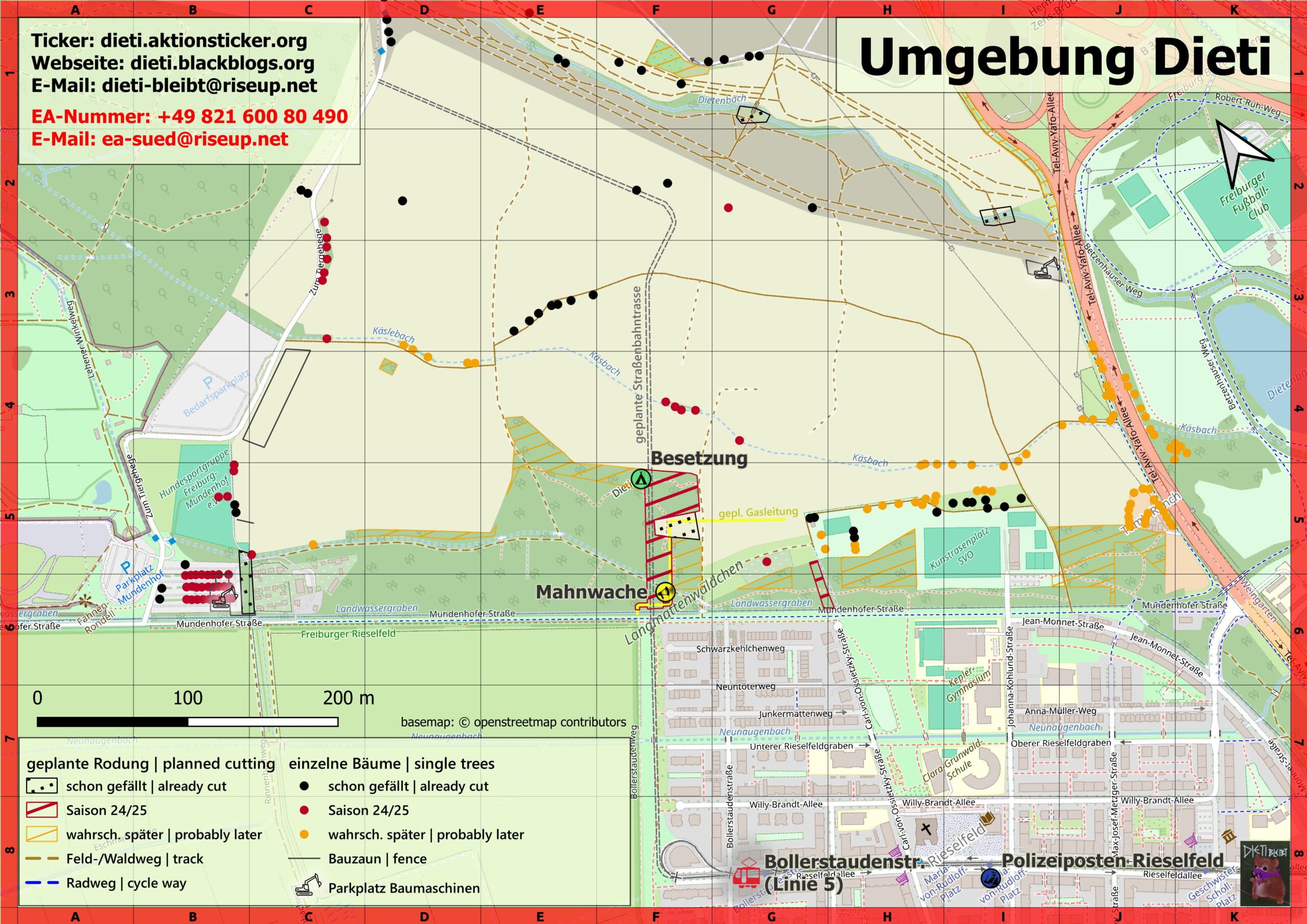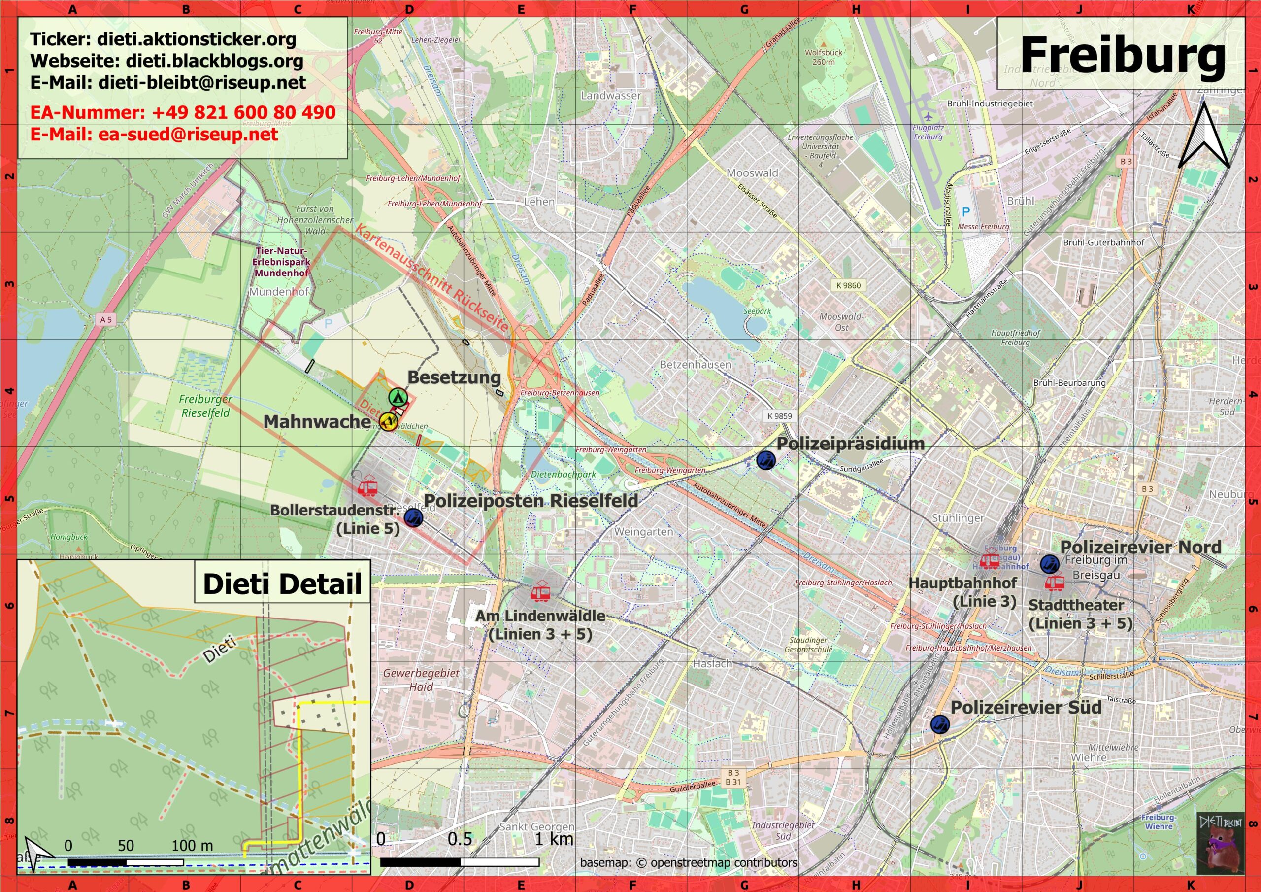 Man kann von Norden zur Besetzung kommen, indem man mit Straßenbahnlinie 1 Richtung Freiburg bis Paduaallee fährt.
