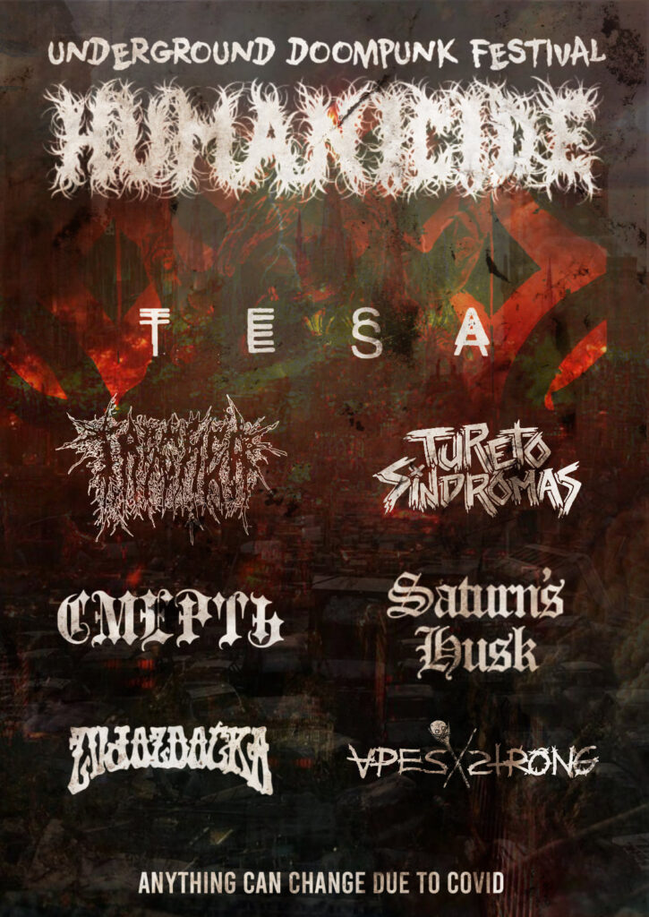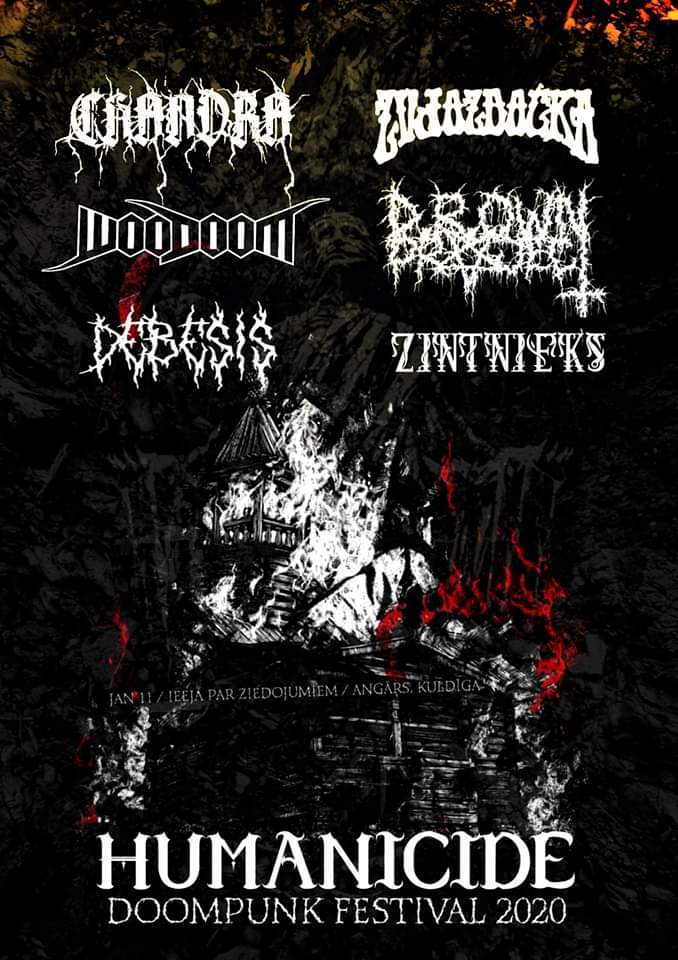 HUMANICIDE 2020 was a blast. It happened in Kuldīga city. A well known metal-head town in early 2000s. We teamed up with local guys from doom band ZVJOZDOČKA and organised the festival at their rehearshal space that was an empty industrial house on the border of the city. The virus was already a thing back then and we managed to do the show right before it started to spread in Latvia. Around 120 people showed up. We invited Chezch post-black metal band CHANDRA and a few new names in Latvian doom / punk scene – WOODOOM, ZVJOZDOČKA, DEBESIS, D.R.OWN and ZINTNIEKS. The night was heavy. A week in advance we made a DIY bar, sold everything for 2 Euros. Bar got its own tape juke-box. We had a backstage balcony to watch the show from higher ground.