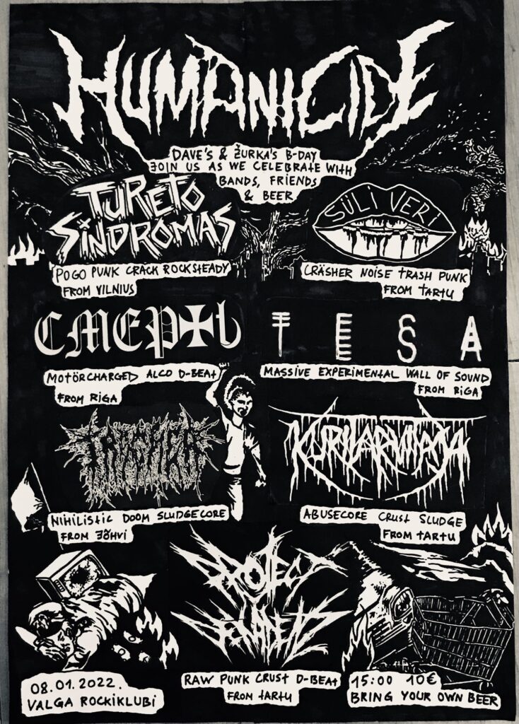 For 2022 edition we booked Valga Rockiklubi on the bordercity of Latvia and Estonia. No events were allowed in Latvia till January 11th so making it in Estonia was a logical solution. You could get there with a train from Riga, the last train station being on the Estonian side, so you were able to legally cross the border with no virus rectrictions check-up. A loophole. Most of 2021 edition bands got booked for 2022. Latvian biggest name in post scene TESA, WOODOOM crust reincarnation СМЕРТЬ, Tartu punk bands PROJECT DEKADENZ, KURITARVITAJA, SÜLIVERI, a doom band TRACHEA together with Vilnius’ TURETO SINDROMAS. The venue had no bar so visitors were allowed to bring their own alcohol. Few days before the show PROJECT DEKADENZ and SÜLIVERI cancelled due to positive covid tests. So MUUMIORU SS from Tartu and UGUNS step in.