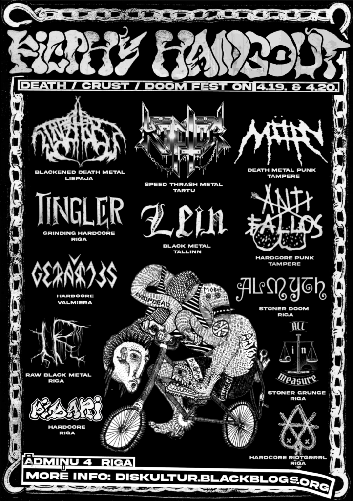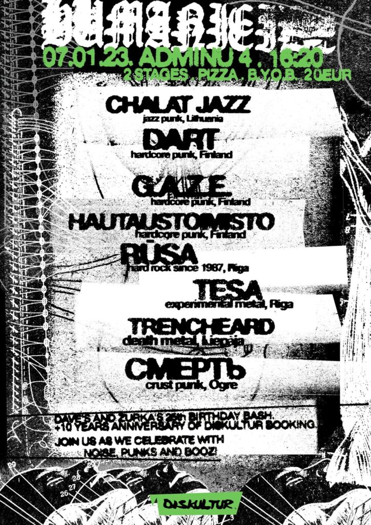 The 2023 edition was the biggest one so far. It happened at Ādmiņu 4 in Riga. Lithuanian jazz punks CHALAT JAZZ, Finnish hardcore punks DART, GAZE and HAUTAUSTOIMISTO, Riga legends RŪSA and TESA, as well as local crust bands TRENCHEARD, СМЕРТЬ and PIDARI performed on 2 stages. The venue was packed. It was a grandiosso night! And a terrible hangover…