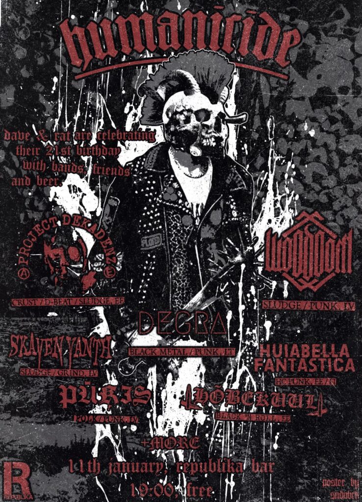 In 2019 we came up with the name HUMANICIDE, taken from DYSTOPIA’s song. The gig happened at REPUBLIKA bar in Riga with black metal punk band DEGRA from Vilnius, black’n;roll band HÕBEKUUL from Tallinn, hardcore punk band HUIABELLA FANTASTICA from Tallinn/Helsinki, crust band PROJECT DEKADENZ from Tartu and sludge bands SKAVEN VANTH and WOODOOM from Riga. PŪĶIS joined for an acoustic jam on the bar floor. Saddly finnish grands ROTTEN SOUND played in Riga on the same night so we ended up splitting the already small Riga scene in half.