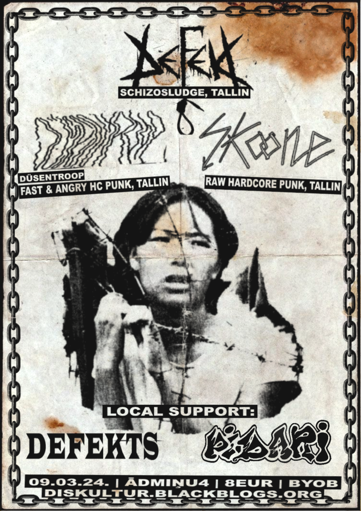 – 8€ donation for touring bands (at doors) – BYOB – Time-table: 19:00 doors 20:00 Pidari then Defekts then Düsentroop then Defekt then Skoone – Ādmiņu 4, Riga 4th(!) floor