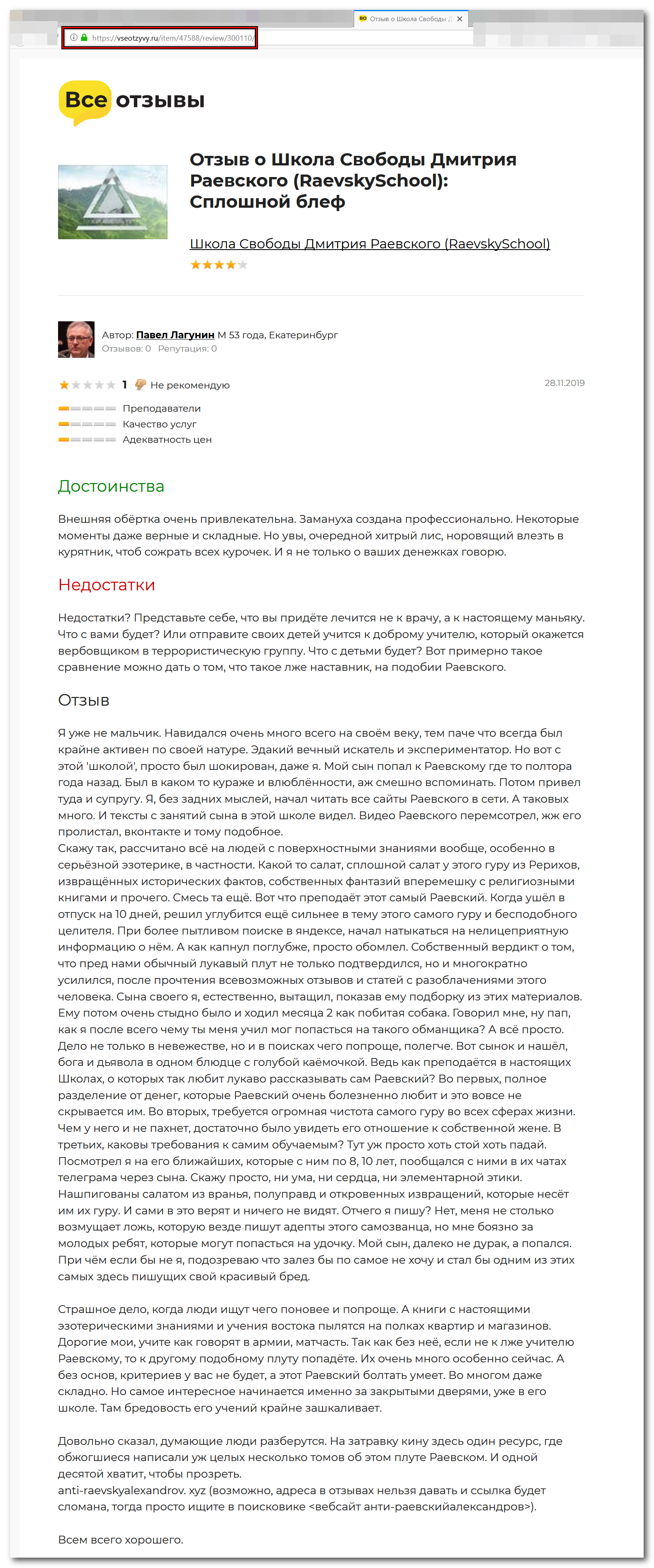Интернет и все социальные сети просто пестрят всякими распиаренными статейками, лживыми отзывами, а также сказками о себе любимом, как самого месье Раевского так и его последователей (например, здесь vk.com/raevskyschool).