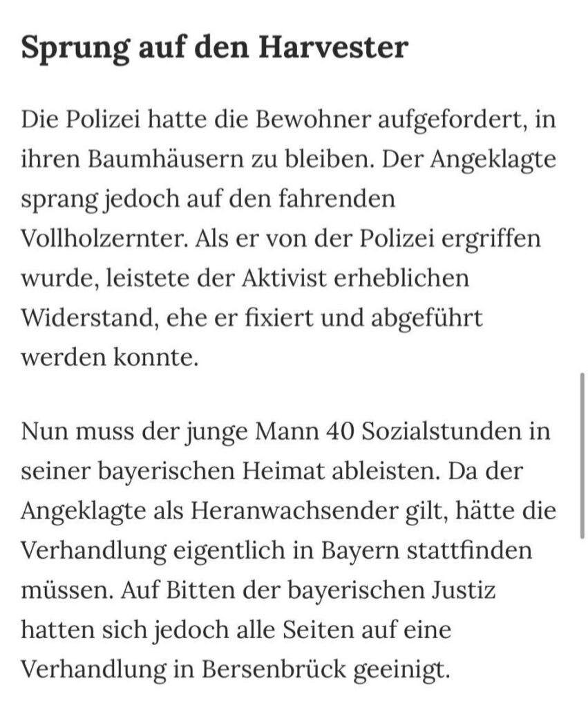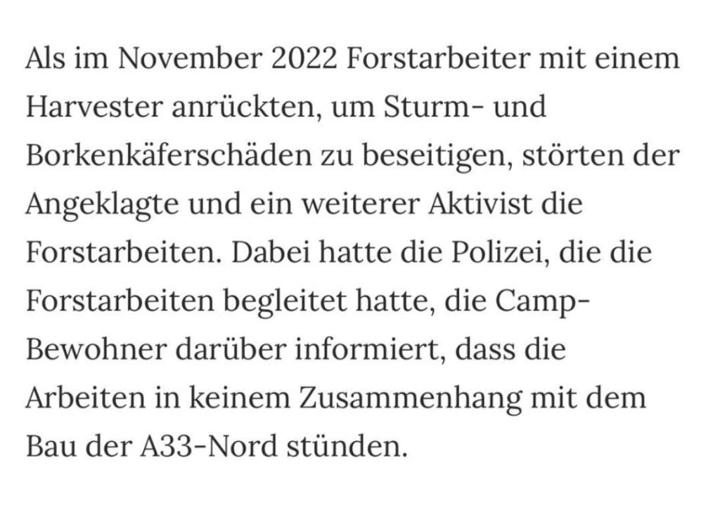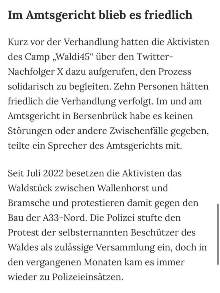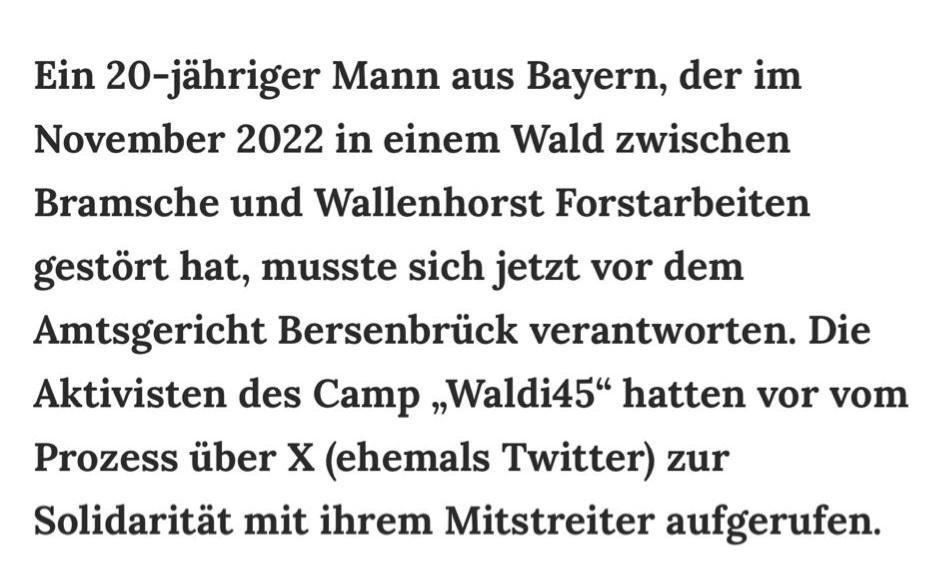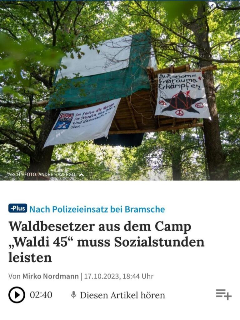 Die NOZ (Neue Osnabrücker Zeitung) schreibt, aus Sensationsgier über eine Waldbesetzerin aus der Waldi45 bei Wallenhorst/Rulle. Falsche Geschlechtsidentität, Alter und „Herkunft“ dürfen bei der NOZ nicht fehlen. Die Aktivistin wurde vom Amtsgericht Bersenbrück beschuldigt bei Forstarbeiten gestört zu haben. Die sinnlose Abholzung von Wäldern für Autobahnen und der Zerstörung von Lebensräumen ist in großen Medienhäusern wenig Thema. Nur wenn Menschen versuchen sich diesen Zuständen entgegen zu stellen, werden die Repressionen, die auf Menschen zukommen um jeden Preis genutzt, um die schaulustigen Bürger*innen befriedigt an ihr Medium zu heften, sodass das Medienhaus sich die Taschen, durch die schlechte Berichterstattung, füllen kann. Die journalistische Arbeit der NOZ lässt wirklich zu wünschen übrig, wenn sich nicht mal darum bemüht wird die Geschlechtsidentität eines Menschen richtig zu prüfen – offensichtlich gab es ja Quellen beim Gericht, die dies mitbekommen haben müssen. Dass solch öffentliches Anprangern sowieso schon widerliche psychische Belastungen nach sich zieht ist klar. Menschen, die ihre Geschlechtsidentität vor staatlichen Institutionen und in der Gesellschaft erst erkämpfen müssen, haben nochmal besonders starke Belastungen zu tragen, wie die Statistiken zur Mortalität solcher Menschen zeigen. Schämt euch Menschen von der NOZ. Ihr seid kein Medium mit dem wir kooperieren oder zusammen arbeiten wollen. Wir brauchen euch nicht für unsolidarische Berichterstattung um eure Sensationsgier zu stillen! Fuck NOZ!