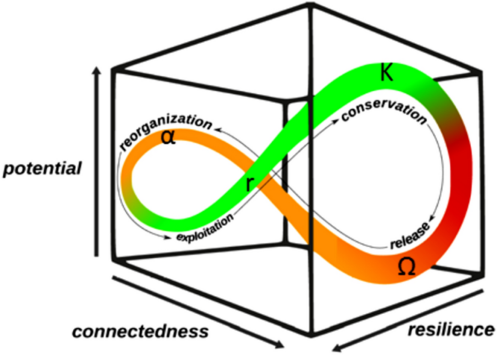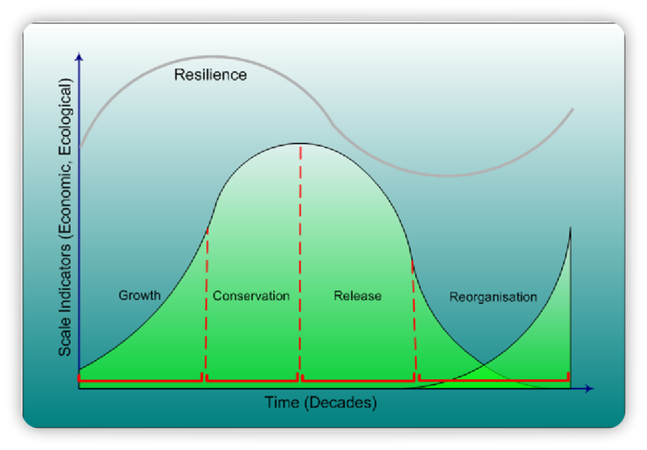 Hollings adaptiver Zyklus wirft ein Licht darauf, wie sich diese Entwicklung abspielt, wenn sie sich gemeinsam mit dem Organisationssystem einer Gesellschaft entwickelt. Es folgt einem exponentiellen Wachstumspfad, der sich dann einpendelt, wenn das System die Sättigung erreicht. Und sie sinkt, wenn das System entweder an interne Grenzen stößt oder der Konkurrenz durch ein neues, überlegenes System ausgesetzt ist. Wenn die Rückgangskurve, die den Kollaps des alten Systems abbildet, mit der S-Kurve überlagert wird, die die Geburt des neuen Systems abbildet, sieht sie wie ein X aus.