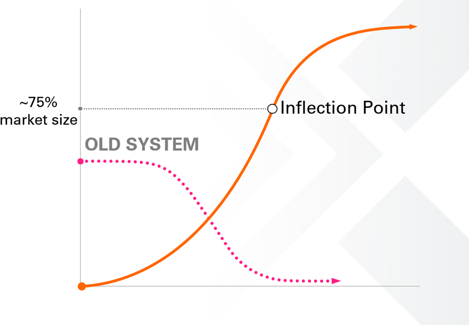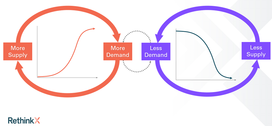 Technologische Umwälzungen folgten im Laufe der Geschichte dem gleichen Muster. Wie Rethinking Humanity anhand des Technology Disruption Framework von Seba zeigt, beginnen sie langsam und basieren auf Innovationen, die auf früheren Technologien in verschiedenen Sektoren aufbauen, diese kombinieren und neu konfigurieren. Wenn diese Innovationen breitere gesellschaftliche Bedürfnisse oder Anforderungen effizienter und effektiver erfüllen als etablierte Instrumente, werden sie häufiger eingesetzt. Technologische Disruptionen neigen dazu, ihrem eigenen Learning-by-Doing-Muster zu folgen. Je mehr sie eingesetzt werden, desto billiger werden sie. Und wenn sie zehnmal billiger sind als etablierte Tools – heute messen wir das in Geld, aber wir reden in Wirklichkeit davon, dass sie ein Zehntel der Energie oder Ressourcen der vorherrschenden Technologien verbrauchen – sind sie wirtschaftlich nicht aufzuhalten: Es macht einfach keinen Sinn, am alten Tool festzuhalten. Schnell wird die disruptive Technologie dann zur Massenakzeptanz hochskaliert und flacht ab, wenn sie allgegenwärtig wird. Wellen des technologischen Wachstums und Niedergangs folgen dem gleichen Muster wie Hollings adaptiver Zyklus. Während die neue Technologie exponentielle Verbesserungen bei Kosten, Effizienz und Leistung erfährt, erleben die etablierten Technologien das Gegenteil: eskalierende Kosten, sinkende Effizienz, schwindende Leistung, die in sinkenden Erträgen und einer Verschlechterung der Wettbewerbsfähigkeit gipfeln.