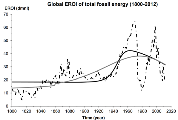 Zahlreiche Studien haben gezeigt, dass der EROI der globalen fossilen Brennstoffe in den 1960er Jahren seinen Höhepunkt erreichte und nun endgültig rückläufig ist.