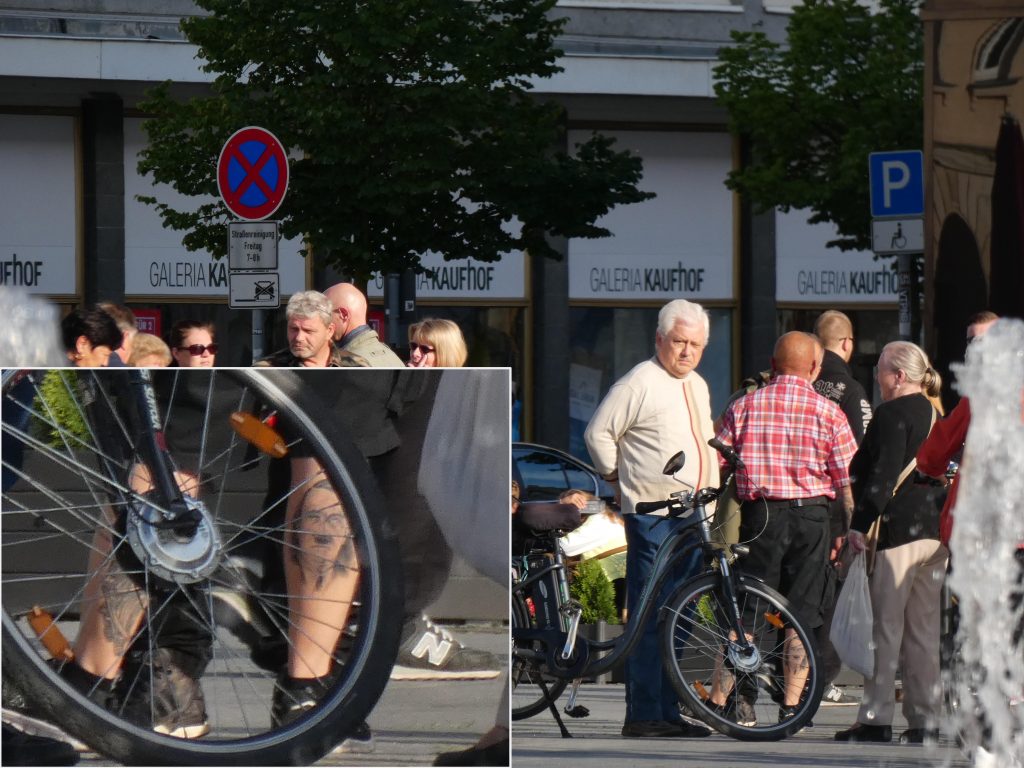 Die rechtsoffene Atmosphäre nutzten regionale Neonazis um etwa im alten Kameradschaftsverbund mit eigenen Transparenten an den Montagsdemos teilzunehmen. Auch als einer der Teilnehmer eine etwa handgroße Tätowierung von Adolf HITLERs Konterfei auf seiner Wade zur Schau stellte, führte die nicht zum Ausschluss von der Veranstaltung durch den Anmelder. Das Zeigen des Tattoos stellt eine Straftat gemäß §§86, 86s StGB – Verwenden von Kennzeichen verfassungswidriger Organisationen dar. Erst die Ermittlungen und Personalienfeststellung durch die Kriminalpolizei hielten den Tätowierten von der Teilnahme ab. Bei dem Mann handelt es sich um den in Woldegk geborenen 51jährigen Enrico STARK. An diesem Tag startete er wegen der Personalienfeststellung erst kurz nach dem Hauptfeld und verdeckte die Tätowierung notdürftig mit Hilfe eines um die Beine gebundenen Sweaters. Neben ihm und seinem – bereits bekannten – Begleiter Bernd SCHOON, waren viele andere offensichtliche Nazis Teil dieser Veranstaltung.