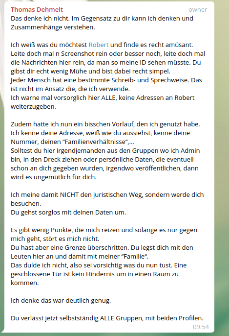Auch löscht Dehmelt fleißig alles, was nicht in die Ideologie der Impfgegner*innen-Echokammer passt. Rechte Inhalte hingegen, antisemitische Memes, menschenfeindliche Posts und Neonazipropaganda bleiben unzensiert. Personen, die mehrfach aus seiner Sicht „Unpassendes“ schreiben, werden aus den Gruppen entfernt und zudem mit einem „Hausbesuch“ bedroht. So z.B. geschehen in seiner Propagandagruppe Freiheitsboten_Neubrandenburg.
