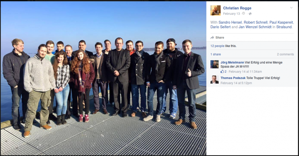 Skroch im Kreise identitärer Führungskader Daniel FUNKE aus Ribnitz (1.v.l.), David RATAJCZAK (Niedersachsen, mittig), Heinrich MAHLING (Hessen, 2v.r.) und Philipp LEMM (Greifswald, rechts) von der Greifswalder Burschenschaft Rugia und Gründungsmitglied der Jungen Alternative Mecklenburg Vorpommern.