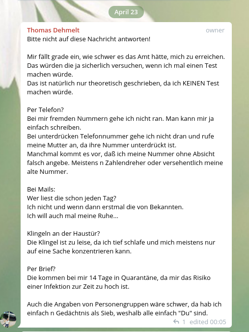 Thomas DEHMELT teilt seine Ideen zur Umgehung der Corona-Maßnahmen – der flapsige Tonfall sollte nicht über die Gefährlichkeit des von ihm propagierten Verhaltens hinwegtäuschen