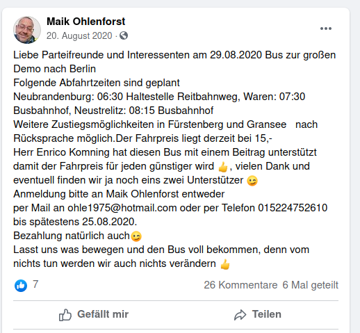 Als ein Video ihrer gemeinsamen Teilnahme schließlich die Neubrandenburger Telegramgruppe erreichte, kommentierte er: „Andreas ist ein sehr guter Freund 😉 wir schätzen uns sehr und das ist nicht verboten und lasse ich mir auch von niemand vorschreiben ;)“ (sic!)