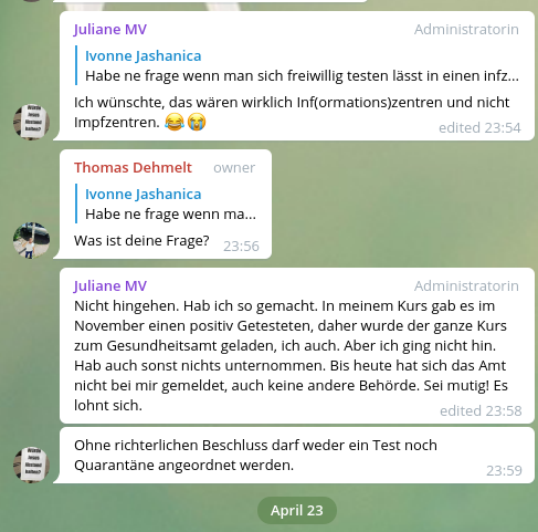 Thomas DEHMELT wird nicht müde, bei allen möglichen Gelegenheiten die „Bürgerlichkeit“, und „Gewaltfreiheit“ der Demonstrationen hervorzuheben und „Diskursbereitschaft“ zu betonen. Auch stellt er sich immer wieder öffentlich als Mitglied der Partei DIE LINKE dar, um den Anschein seiner Bürgerlichkeit zu untermauern. Doch tatsächlich besteht keine Mitgliedschaft. Ein eindrucksvolles Bild seines Demokratieverständnisses zeigt er in den Verläufen der von ihm verantworteten Chat-Gruppen. Hier postet er unter anderem Anleitungen, wie Corona-Tests und Quarantäneanordnungen vermieden werden können und ruft dazu auf, die Kontaktnachvollziehungen des Gesundheitsamtes zu umgehen.