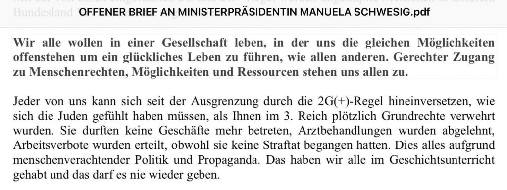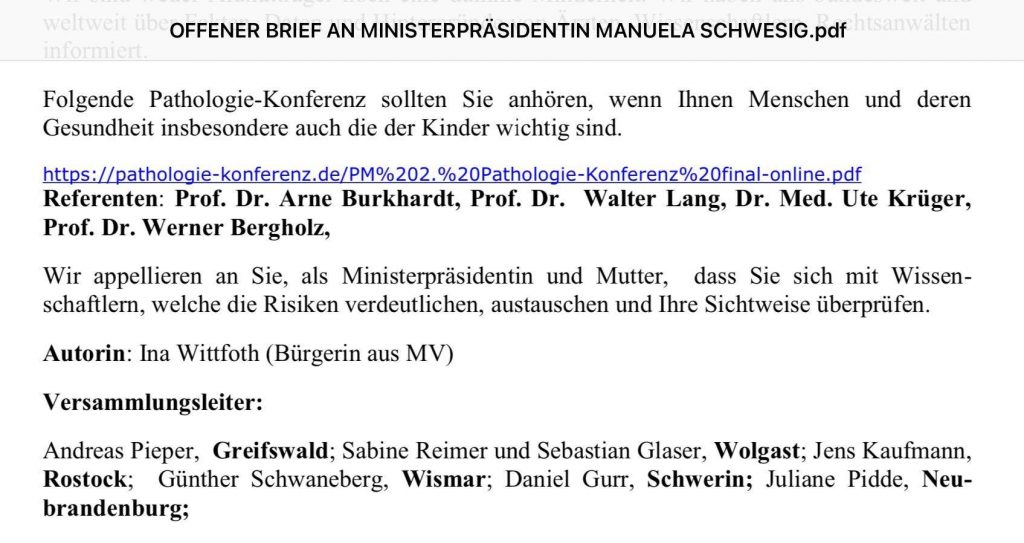 Screenshots des offenen Briefes der Anmelder*innen diverser Corona-Demos in MV an Manuela SCHWESIG