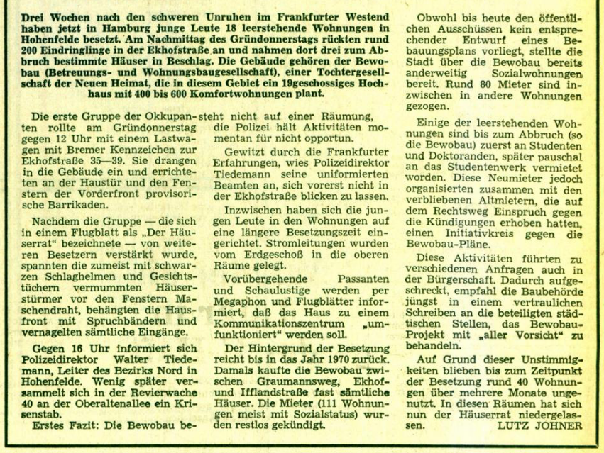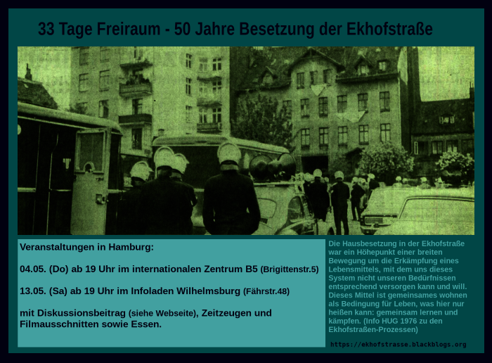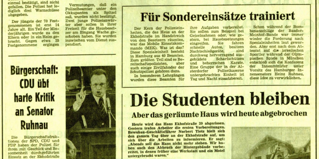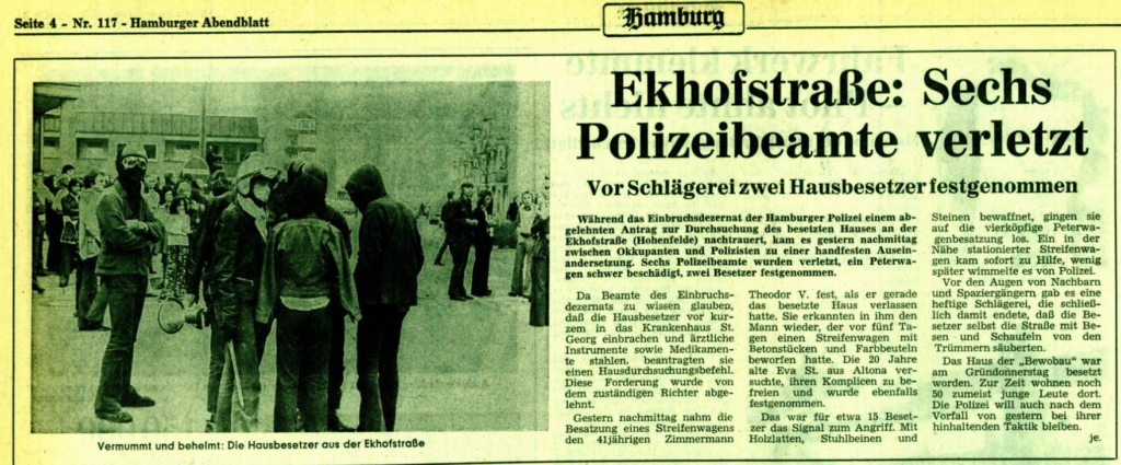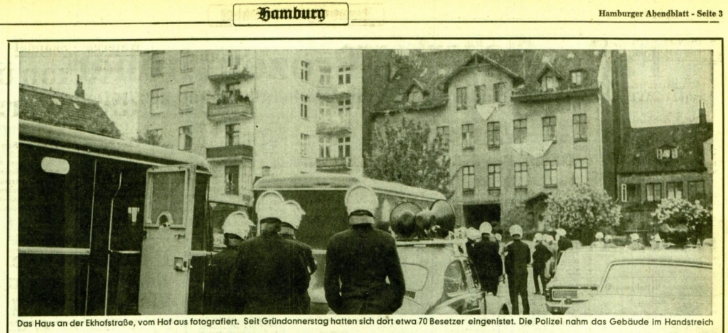 Die Besetzung in der Ekhofstraße für 6 Wochen im Frühjahr 1973 und die anschließende Räumung mit Spezialeinheiten hatte für die Hamburger radikale Linke einschneidende Bedeutung und beschäftigte sie noch Jahre später.
