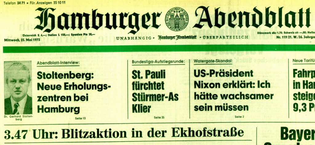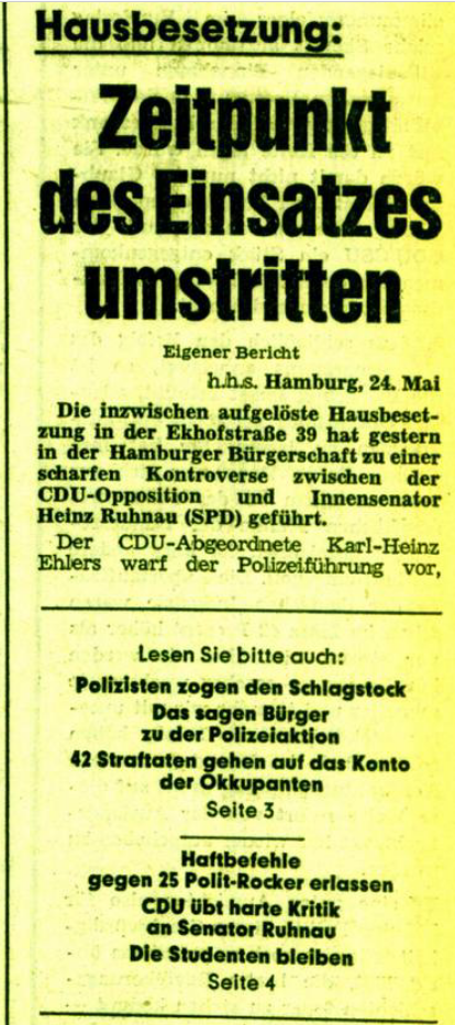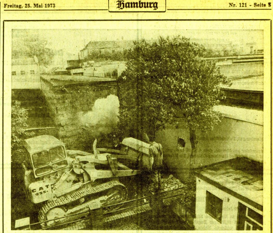 Der Protestzug der Linken gegen die Räumung am folgenden Wochenende (vgl. 26.5.1973) erscheint nicht sonderlich gut besucht, angesichts dessen, dass die linksradikalen Gruppen, also Spontis, RAF-Freunde, Anarchos, KPD, KPD/ML sowie die GIM vermutlich ziemlich komplett aufmarschierten, sowie auch der spätere KBW, der damals in Hamburg noch Kommunistische Gruppe (KG) Hamburg bzw. Sozialistische Studentengruppe (SSG) Hamburg hieß (vgl. 2.5.1973, 29.5.1973, 25.6.1973) und auch der Kommunistische Bund (KB), wobei die Hausbesetzer anprangern, daß sowohl KB als auch die KG Hamburg gemeinsam Ketten vor dem Weg zum ehemals besetzten Haus bildeten.