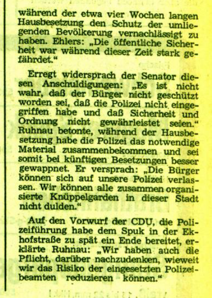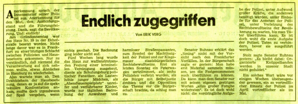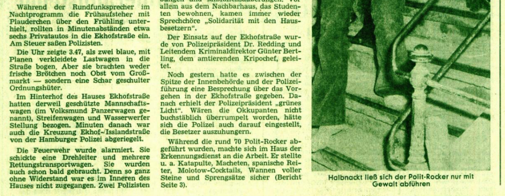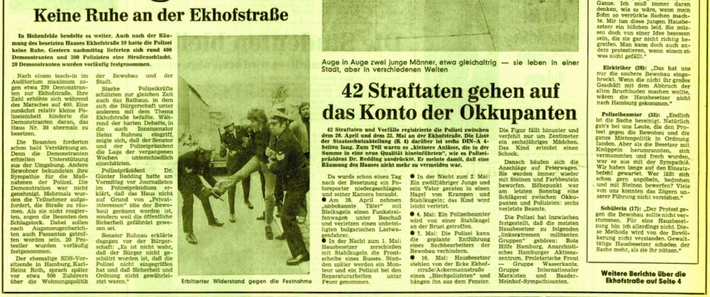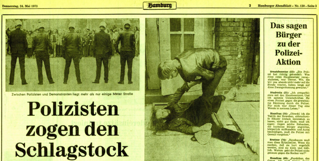 Auch die örtliche Bevölkerung, bei der sich die Besetzer offenbar nachhaltig unbeliebt gemacht hatten (vgl. 20.6.1973, 19.10.1973), wird nach den linken Quellen am Nachmittag erfolgreich eingeschüchtert, ein guter Teil der radikalsten Hamburger Linken aber nachhaltig inhaftiert bzw. kriminalisiert.